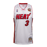White Miami HEAT 2005-06 Dwyane Wade swingman jersey with red and black accents, number 3. - Dwyane Wade Mitchell & Ness Miami HEAT 2005-06 White Swingman Jersey - HOF Edition