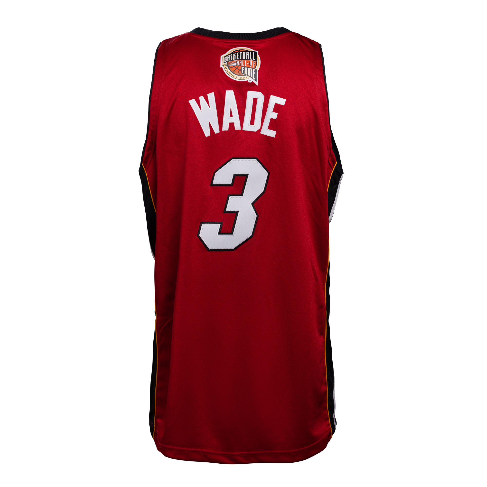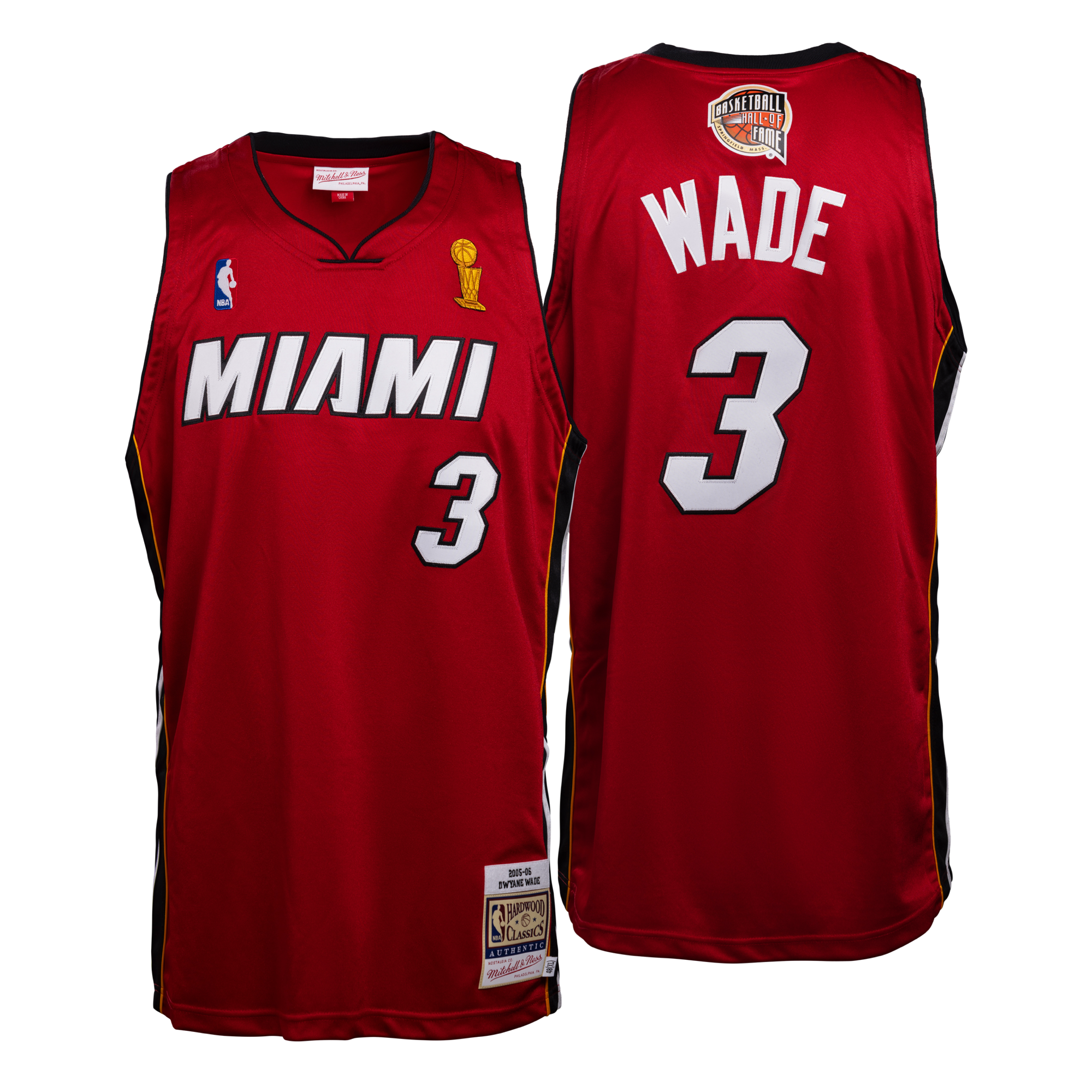 Red Miami HEAT Dwyane Wade Mitchell and Ness authentic jersey with number 3 and Hall of Fame trophy patch. - Dwyane Wade Mitchell and Ness Miami HEAT 2005-06 Authentic Jersey - HOF Edition