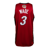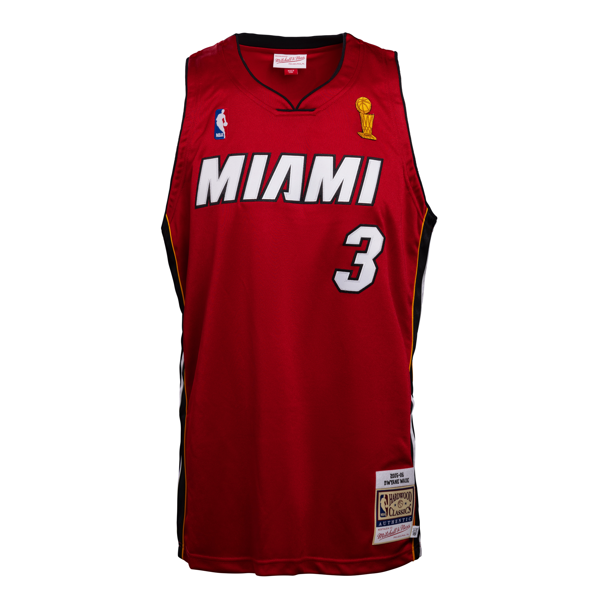 Red Miami HEAT authentic jersey with white number 3 and Wade name on back, black side panels. - Dwyane Wade Mitchell and Ness Miami HEAT 2005-06 Authentic Jersey - HOF Edition