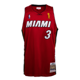 Red Miami HEAT basketball jersey with number 3, NBA logo, and championship patch. - Dwyane Wade Mitchell and Ness Miami HEAT 2005-06 Authentic Jersey - HOF Edition