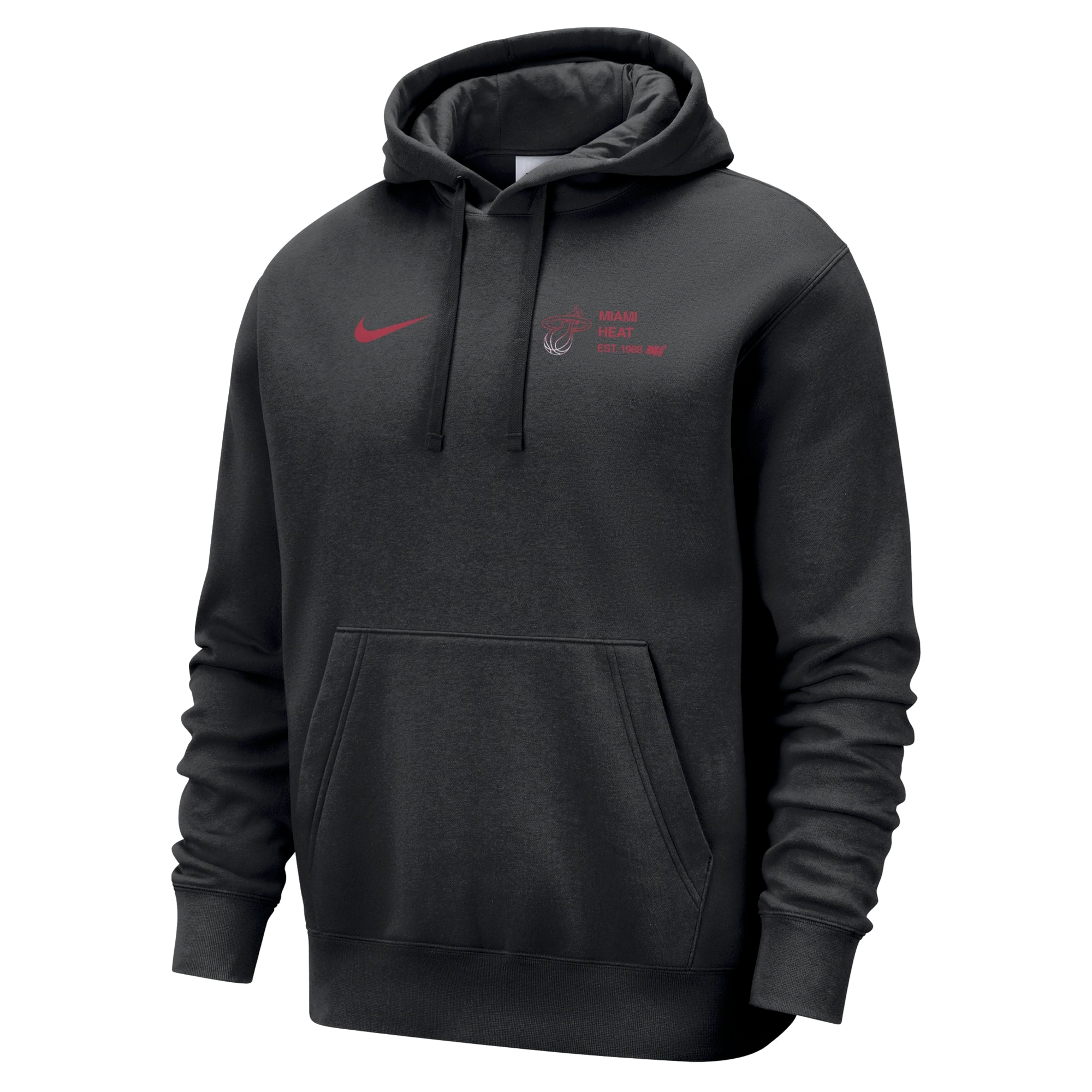 Black Nike pullover hoodie with Miami HEAT logo and red swoosh, front kangaroo pocket, and adjustable hood. - Nike Miami HEAT 2024 Club Pullover Hoodie