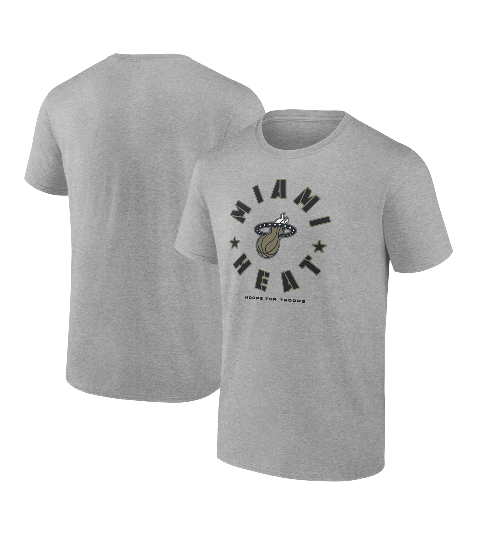 Gray Miami HEAT 2024 Hoops For Troops men's t-shirt with team logo and text design. - Miami HEAT 2024 Hoops For Troops Tee
