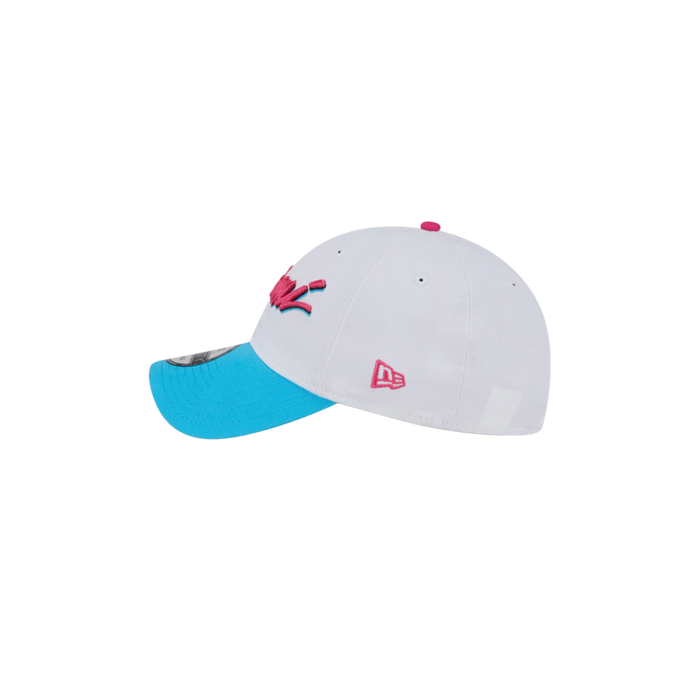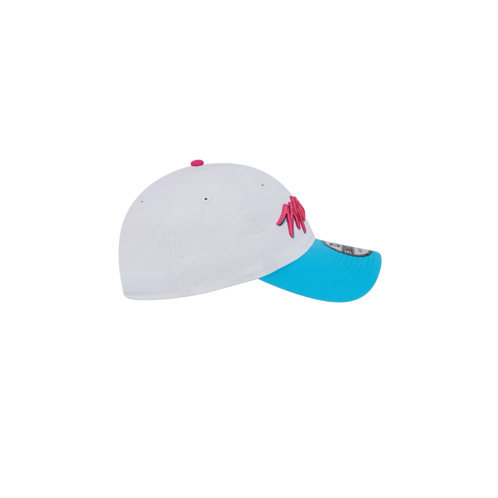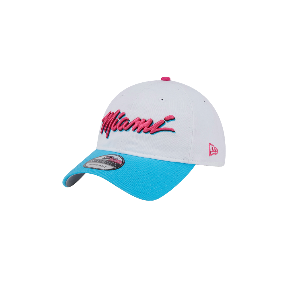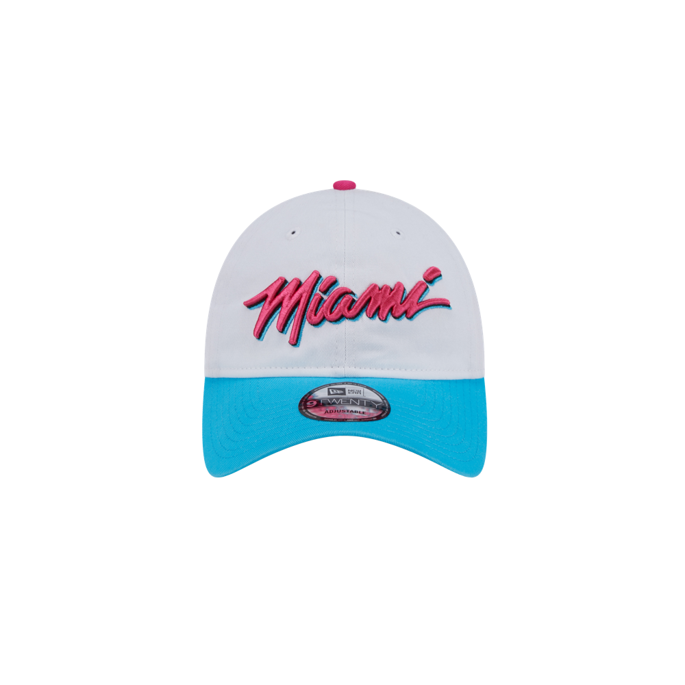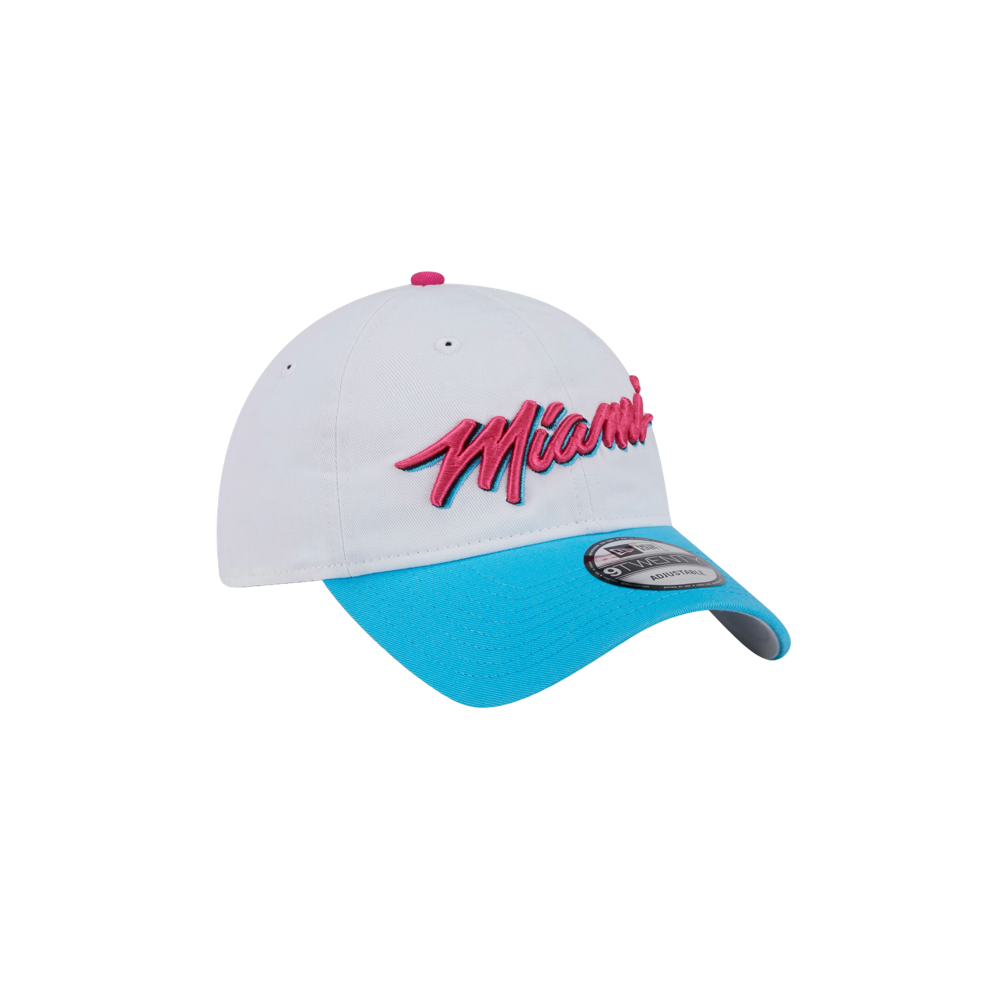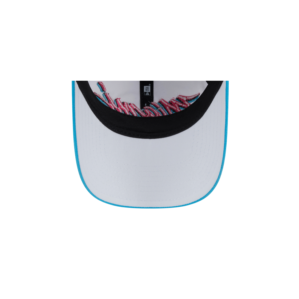 White New Era Miami HEAT Original Vice Wordmark dad hat with black underbill and adjustable strap.