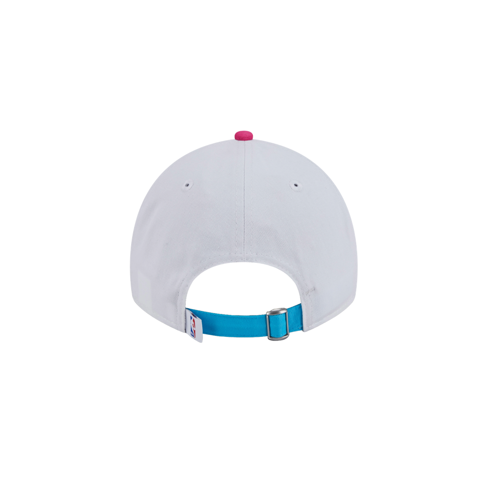 White dad hat with turquoise visor and pink embroidered Miami HEAT logo on front, adjustable strap back.