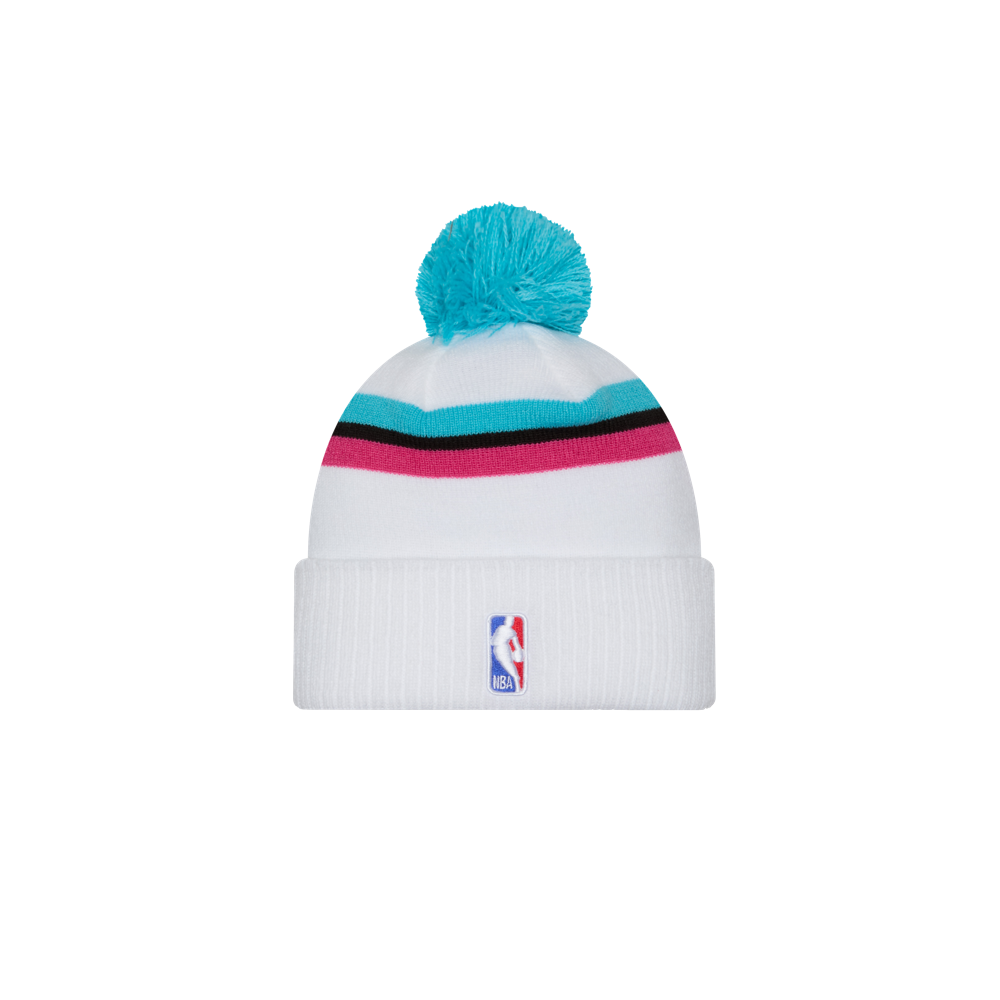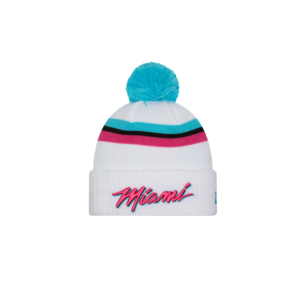 White knit beanie with Miami HEAT Original Vice color stripes in turquoise and pink, topped with a turquoise pom-pom and NBA .