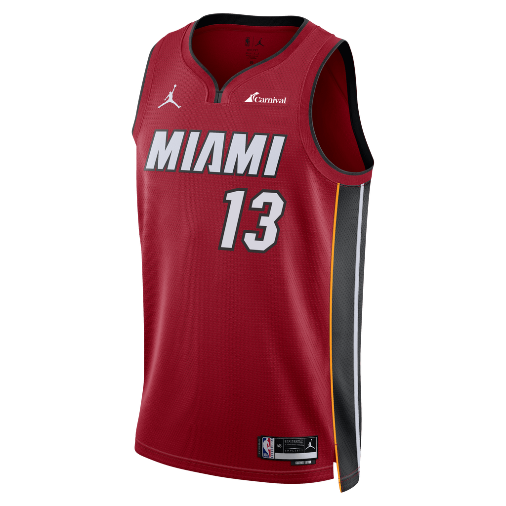 Red Miami HEAT swingman jersey with white number 13 and Adebayo name on back. - Bam Adebayo Nike Jordan Brand Miami HEAT Statement Red Swingman Jersey