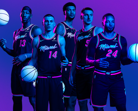 Black T-shirt featuring Bam Adebayo Miami HEAT graphic with vibrant purple and blue text and basketball design. - Bam Adebayo Homage Original Vice Shooting Stars Tee