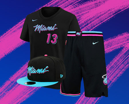 Black Miami HEAT tee featuring Bam Adebayo illustration and bold pink and blue text. - Bam Adebayo Homage Original Vice Shooting Stars Tee