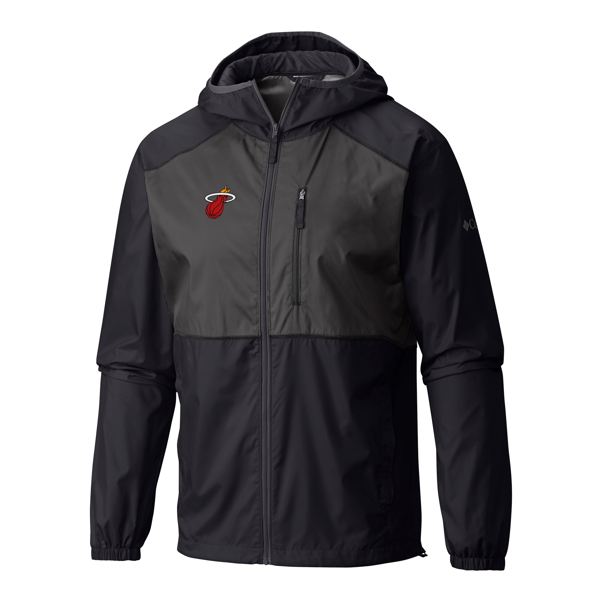 Black Columbia Miami HEAT hooded windbreaker jacket with front zip and chest logo. - Columbia Miami HEAT Logo Flash Windbreaker Jacket
