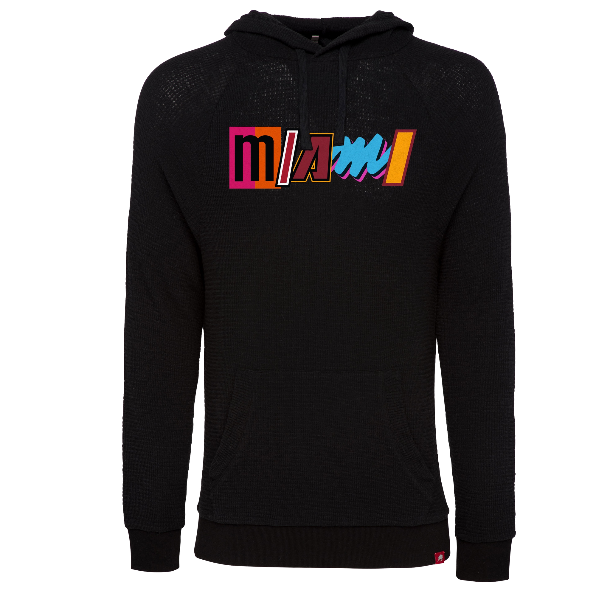 Black Miami HEAT mashup hoodie with colorful layered logo and front kangaroo pocket. - Sportiqe Miami HEAT Mashup Hoodie