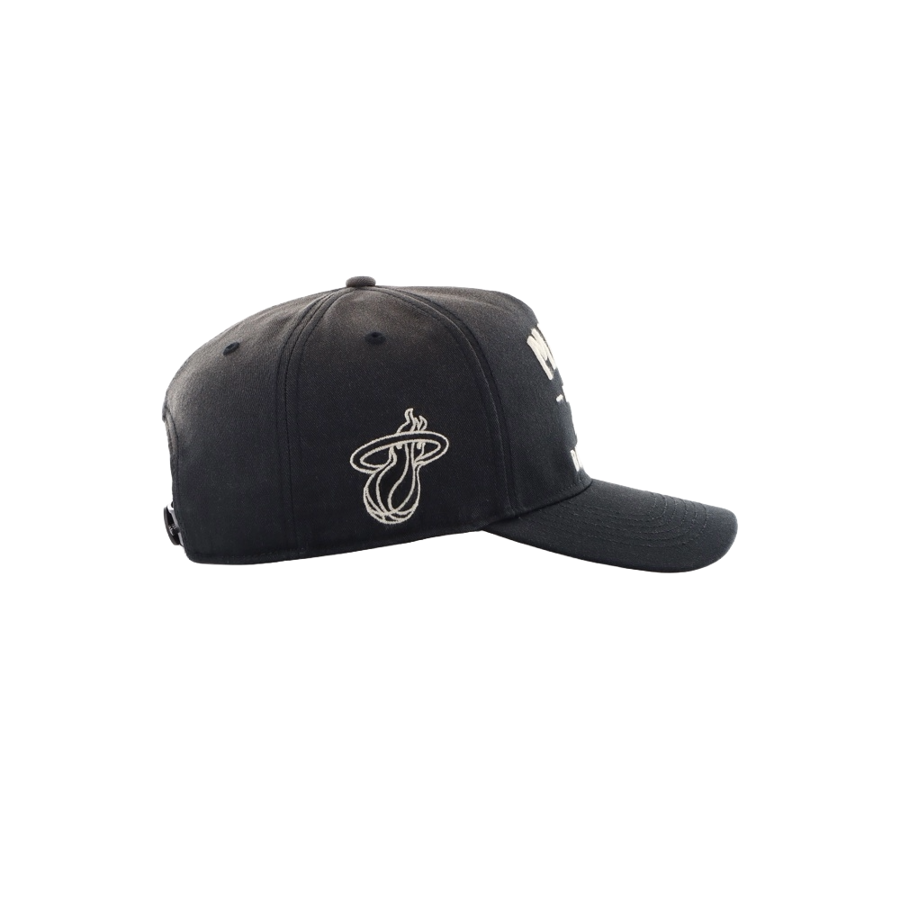 Black snapback cap with Miami Heat logo and embroidered white text, adjustable back strap.