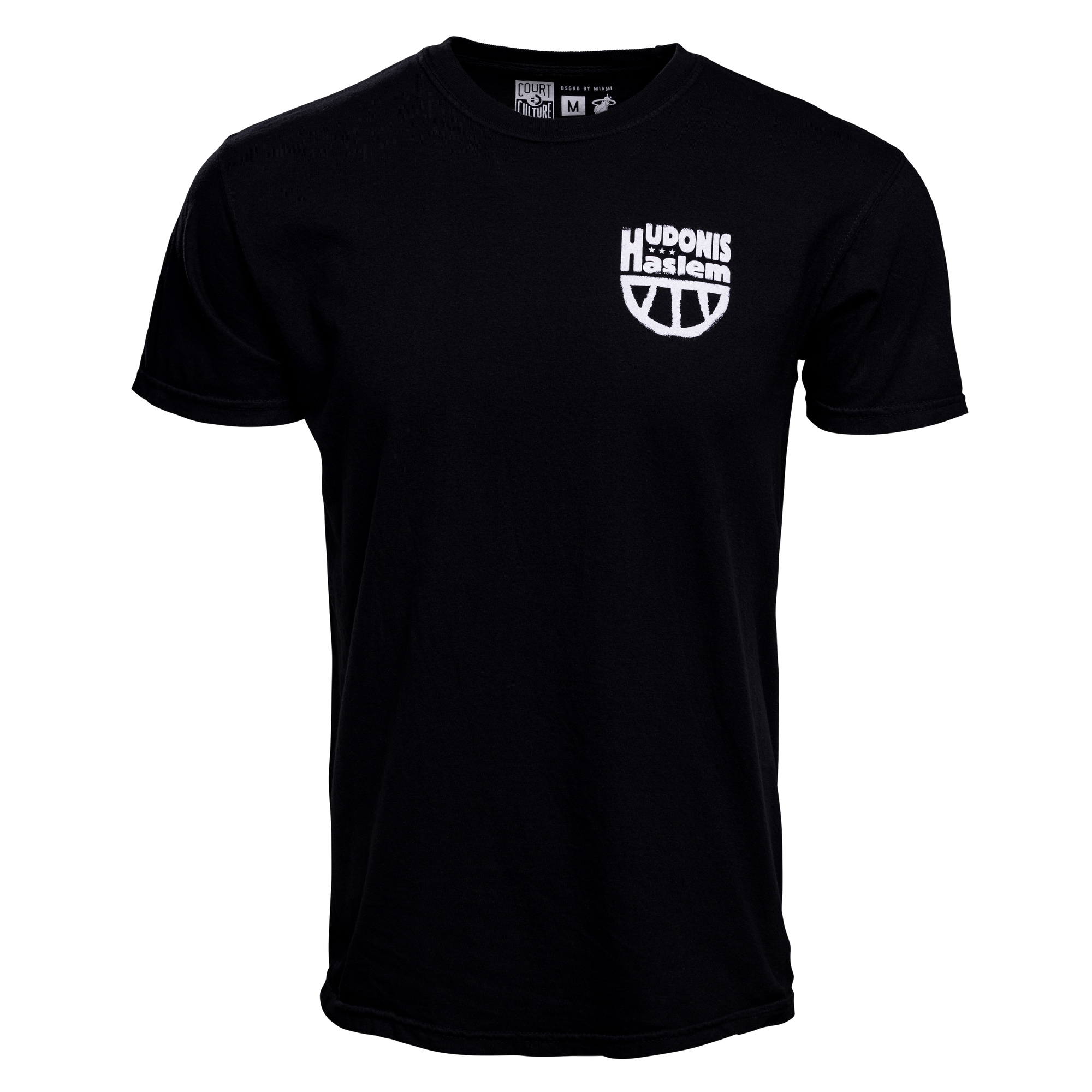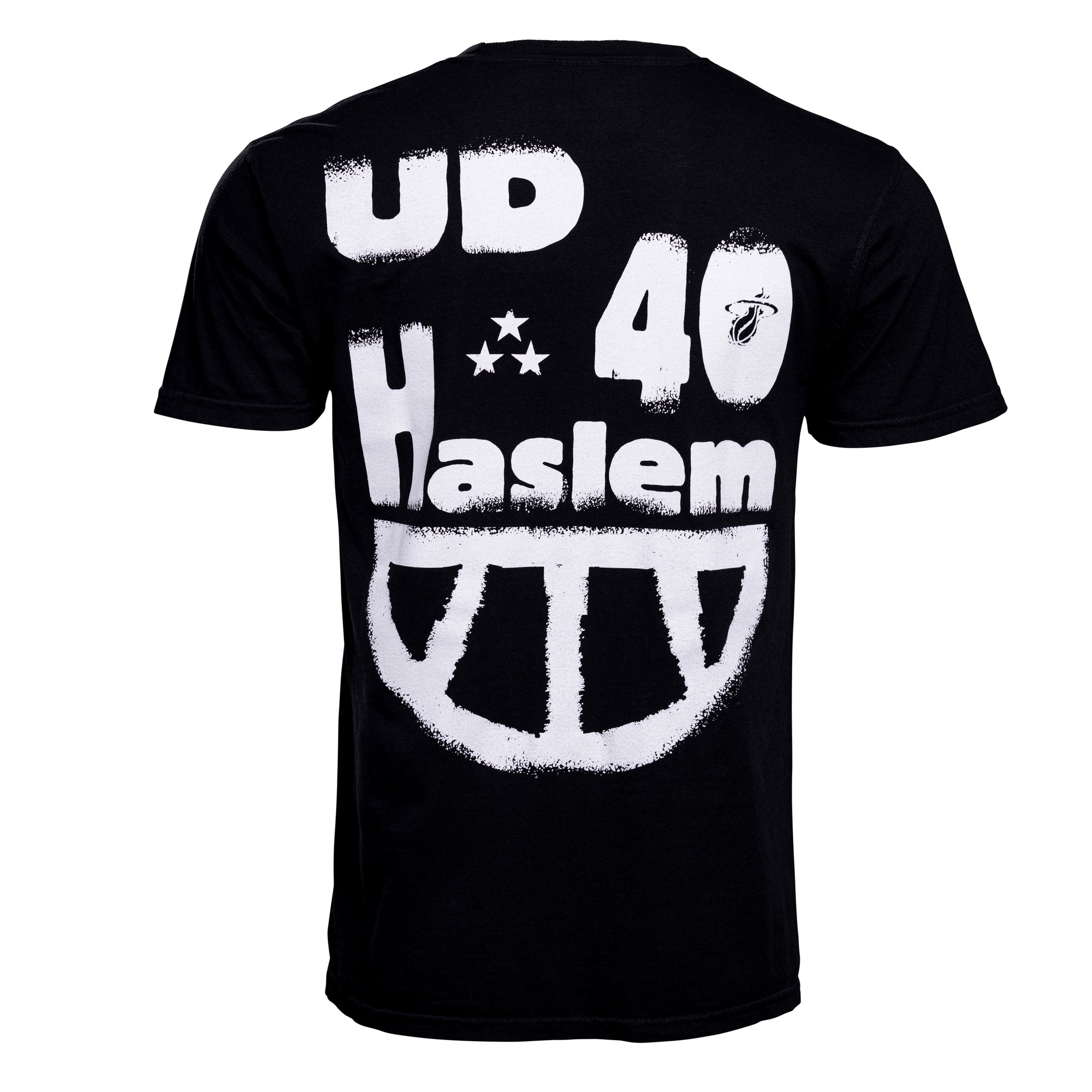 Black unisex tee with white UD Haslem 40 graphic and Miami HEAT logo on the back. - Court Culture Haslem 40 Black Unisex Tee