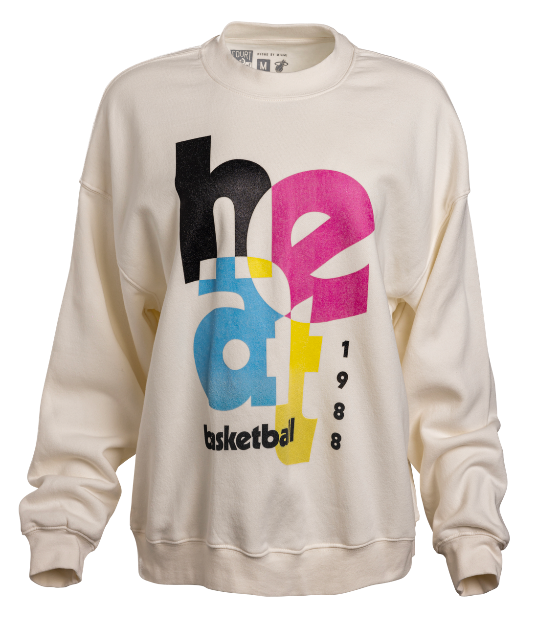 Ivory crewneck sweatshirt with colorful Miami HEAT basketball graphic and 1988 text. - Court Culture Original Vice