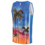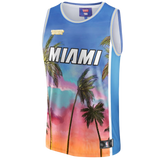 Blue Miami HEAT jersey with palm tree sunset graphic and white trim, sleeveless design. - NBA & KidSuper Studios Miami HEAT Hometown Jersey