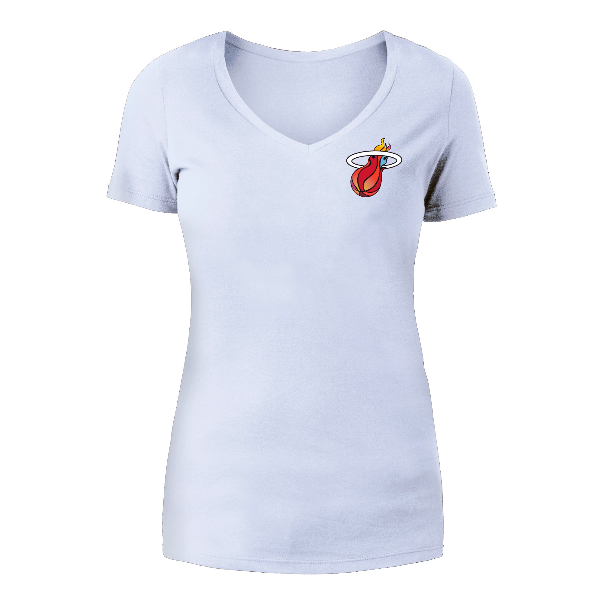 White women's V-neck tee with Miami Heat logo on upper left chest.
