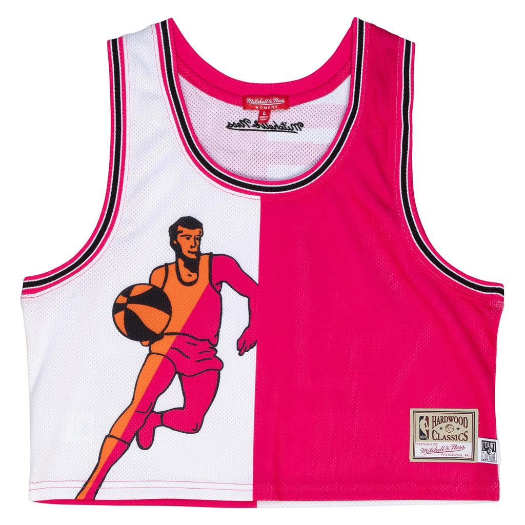 Miami HEAT mesh crop tank with pink and white color block and basketball player graphic. - Court Culture X Mitchell and Ness Floridians Mesh Crop Tank