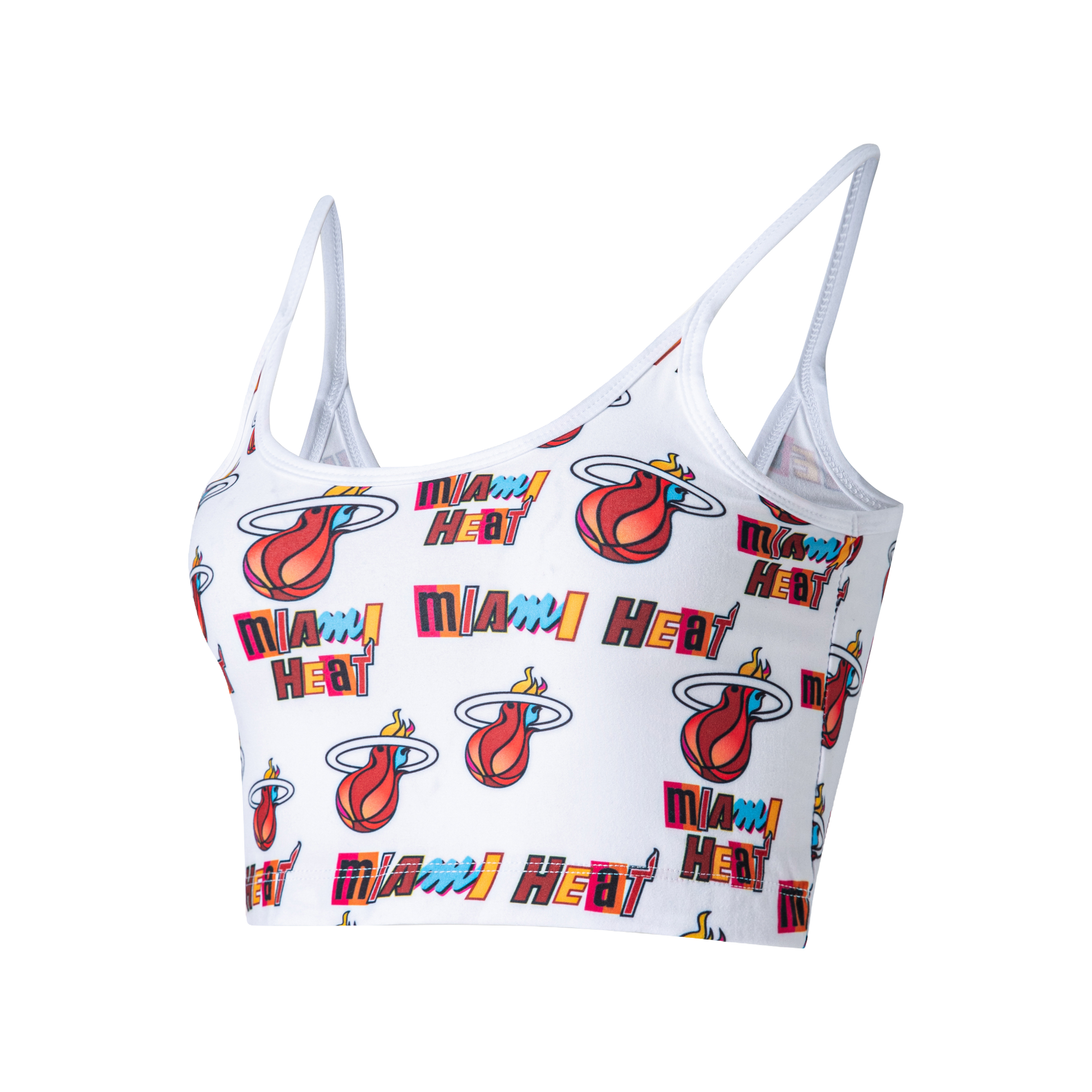 White cropped women's bralette with colorful Miami HEAT logos and graphic text print. - Concepts Sport Miami Mashup Vol. 2 Women's Bralette