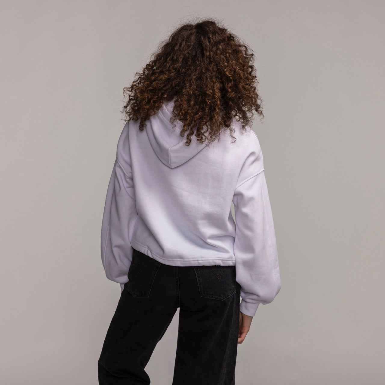 White cropped hoodie with a hood, loose fit, worn by a woman, Miami HEAT style. - New Era Miami HEAT Original Vice Women's Cropped Hoodie