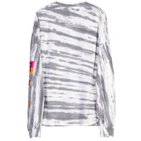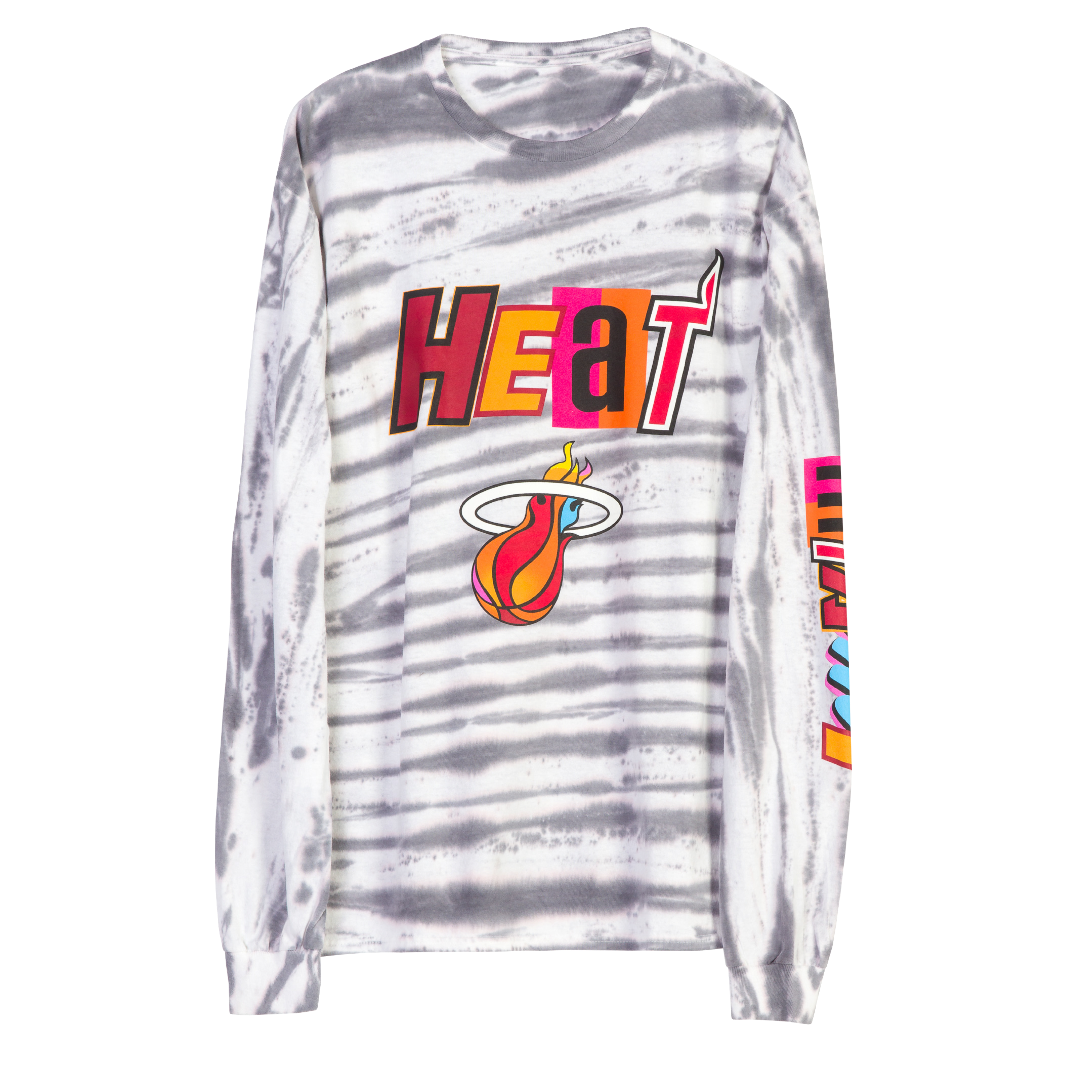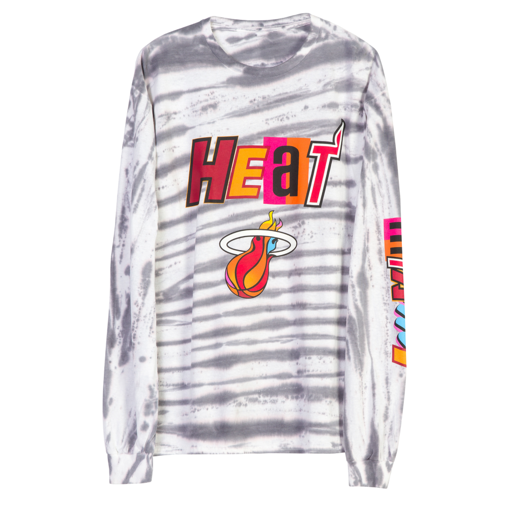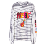 Miami HEAT full court mashup long sleeve tee in gray and white tie-dye with colorful logo on chest and sleeve. - Junk Food Miami HEAT Full Court Mashup Long Sleeve Tee