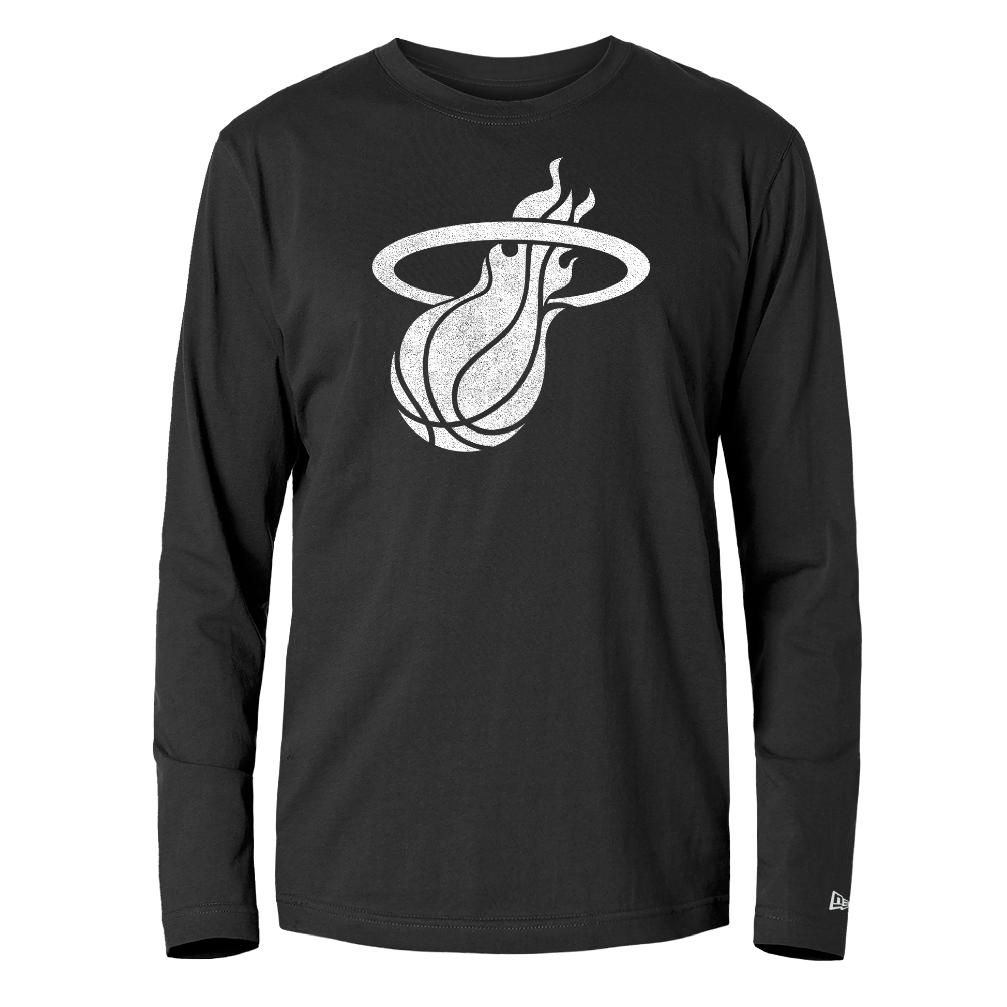 Black long sleeve tee with white Miami HEAT flaming basketball logo on chest. - New Era HEAT Culture Mantra Long Sleeve Tee