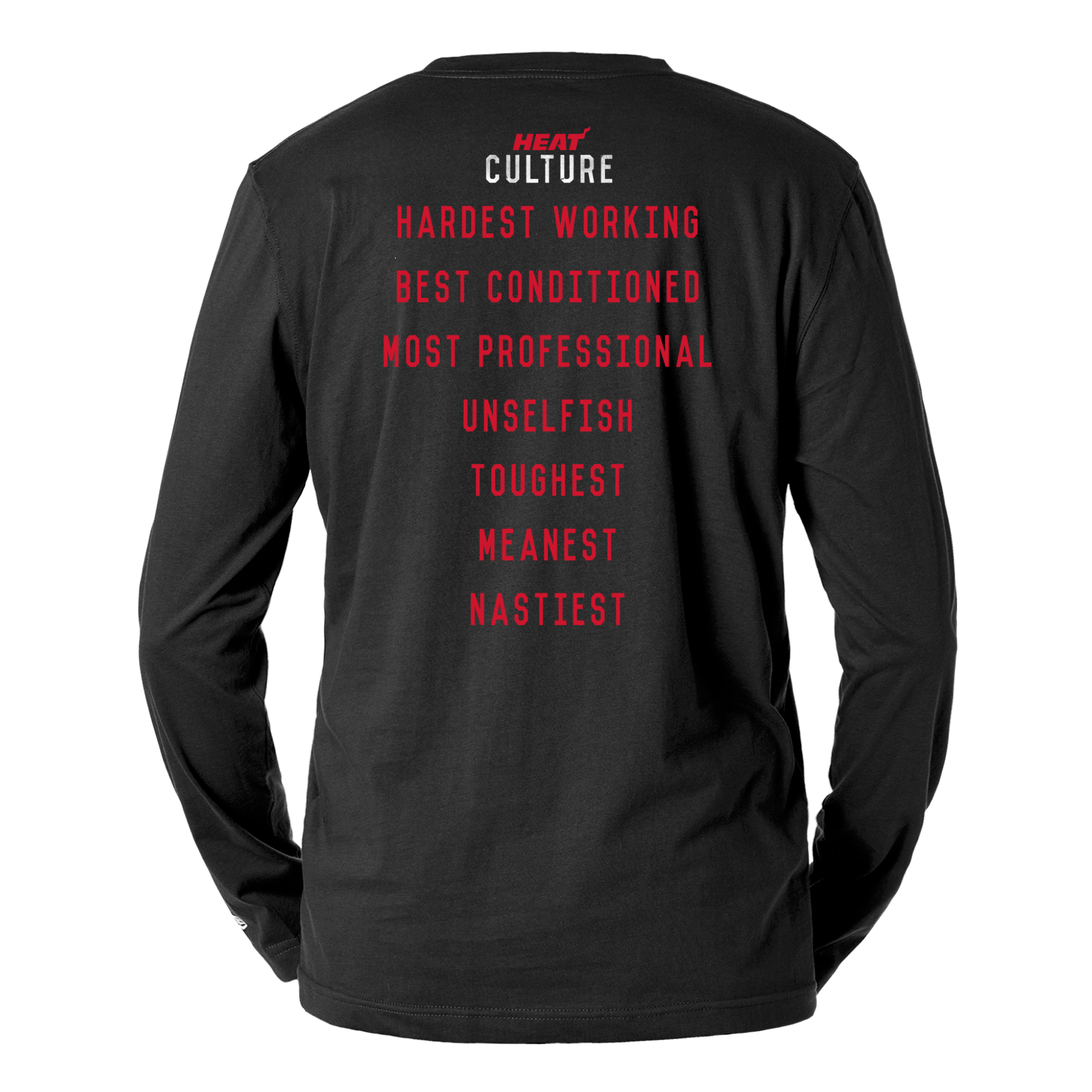 Black long sleeve tee with red Miami HEAT Culture mantra text on back, crew neck, relaxed fit. - New Era HEAT Culture Mantra Long Sleeve Tee