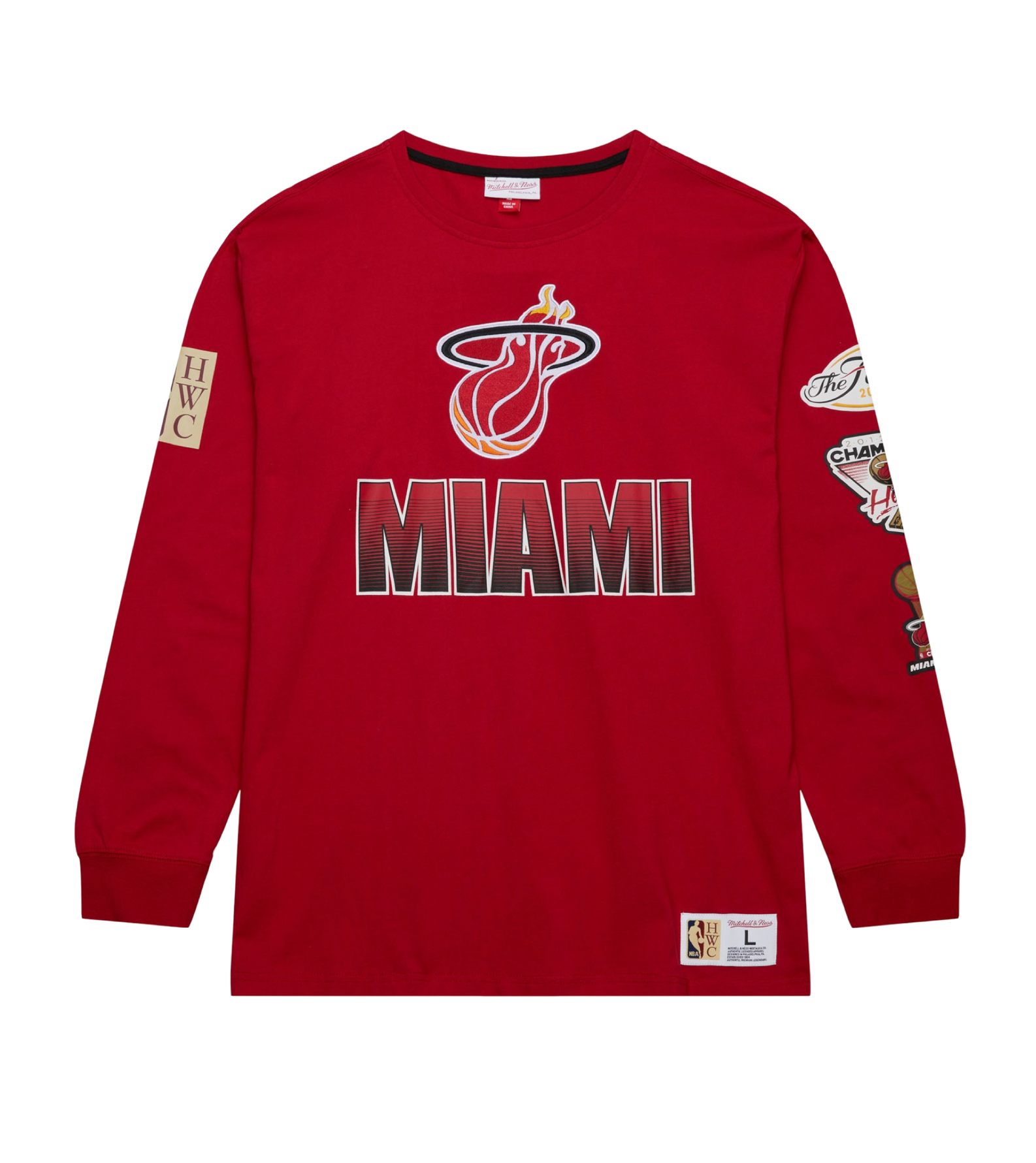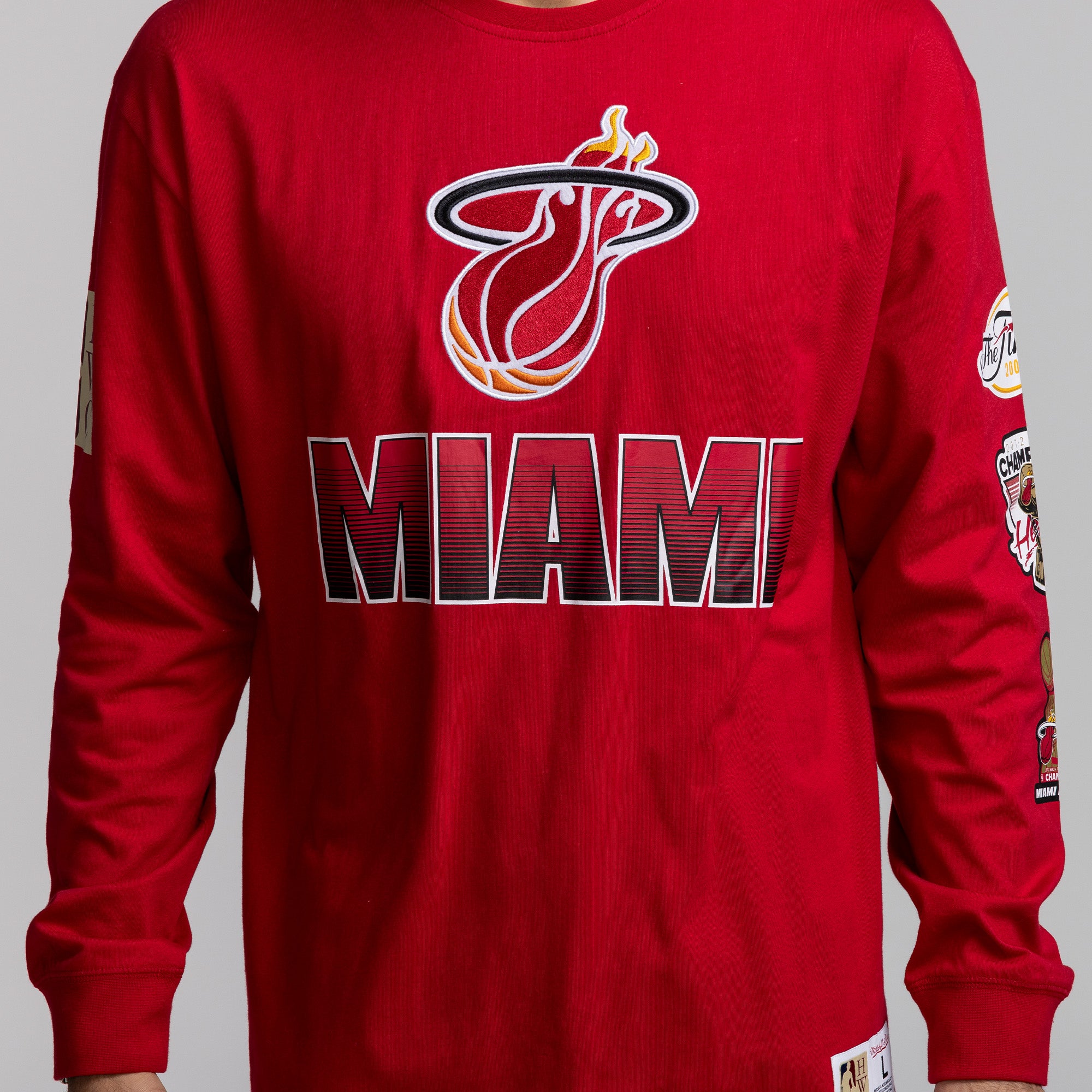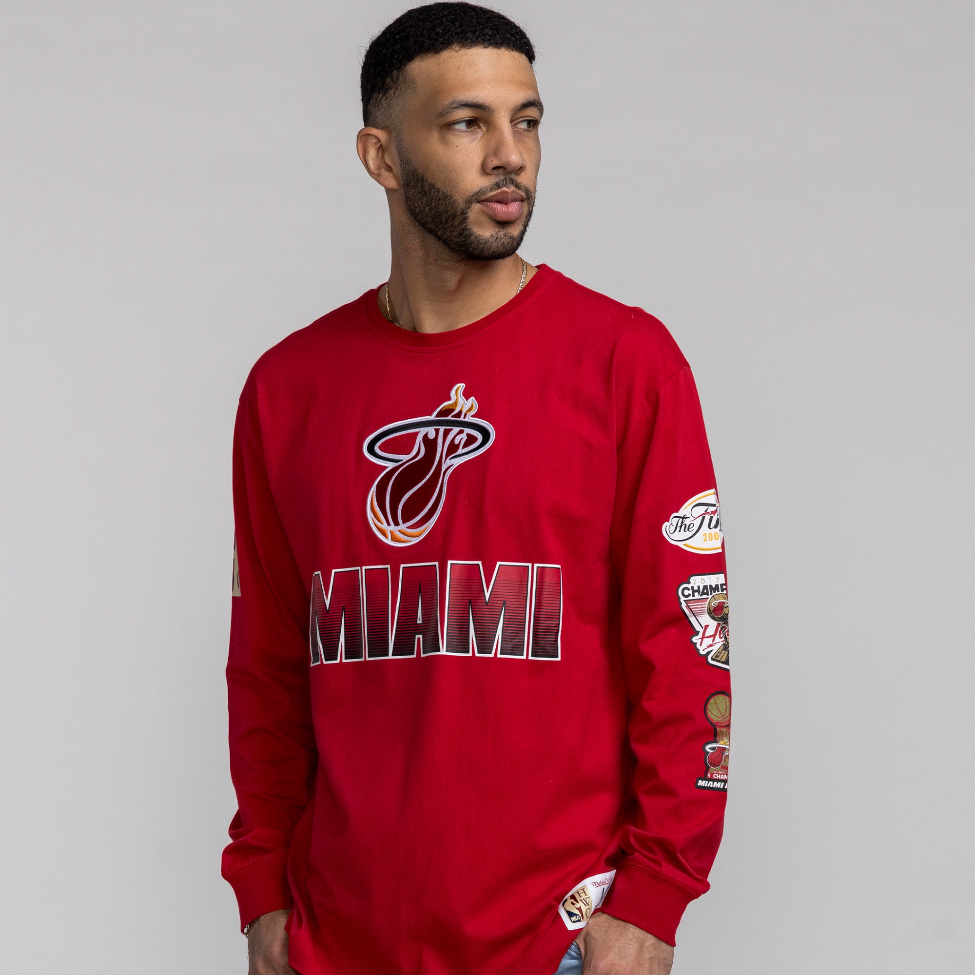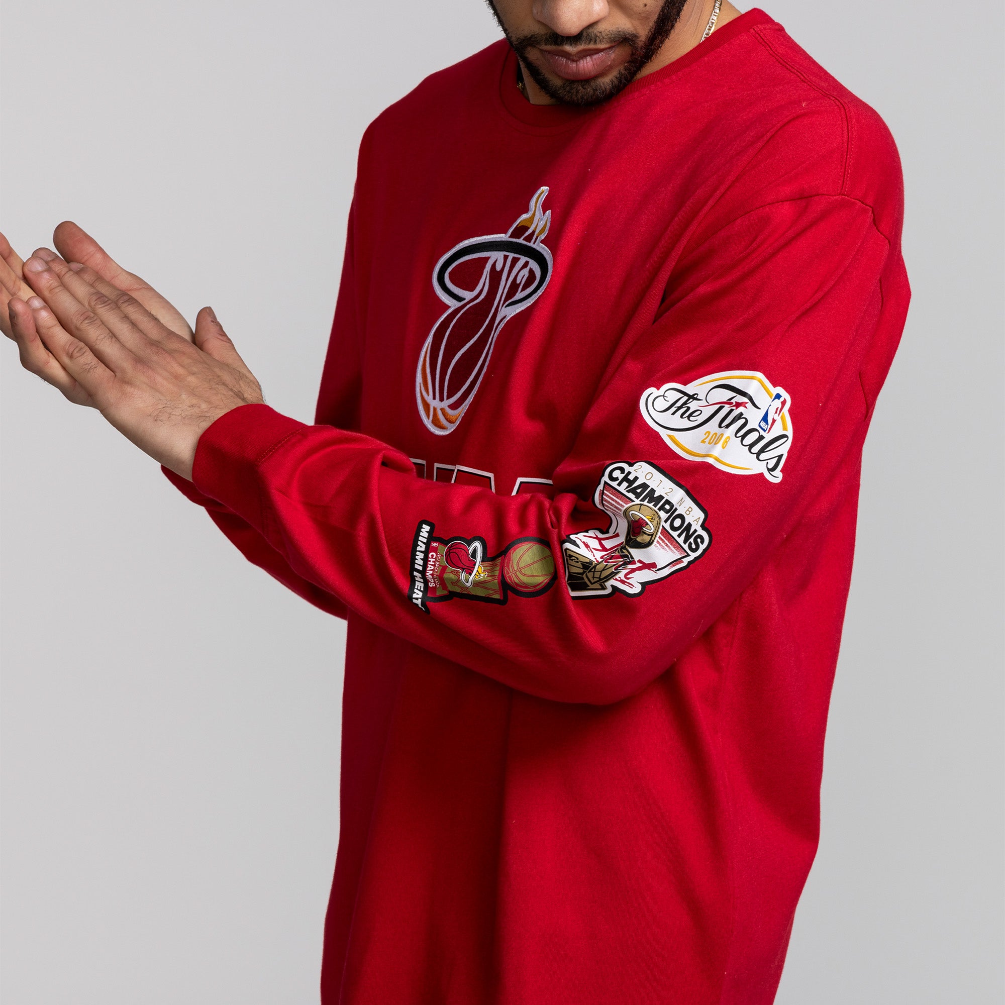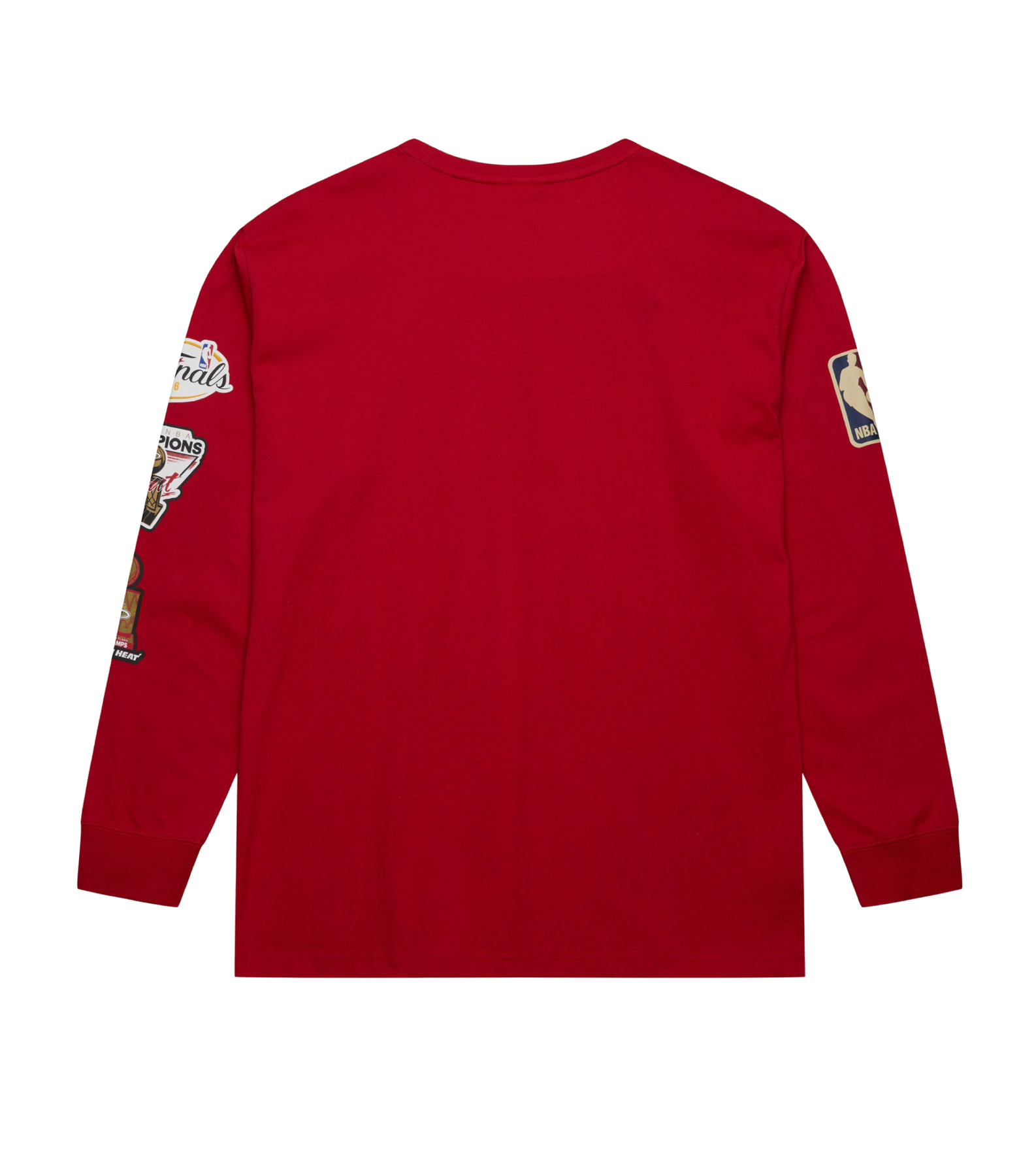 Red Mitchell & Ness Miami HEAT long sleeve tee with team logo on chest and NBA Finals patches on sleeve. - Mitchell & Ness Miami HEAT Allover Vintage Long Sleeve Tee