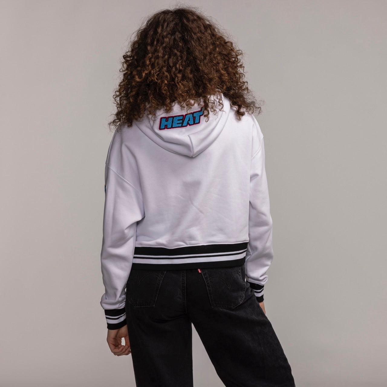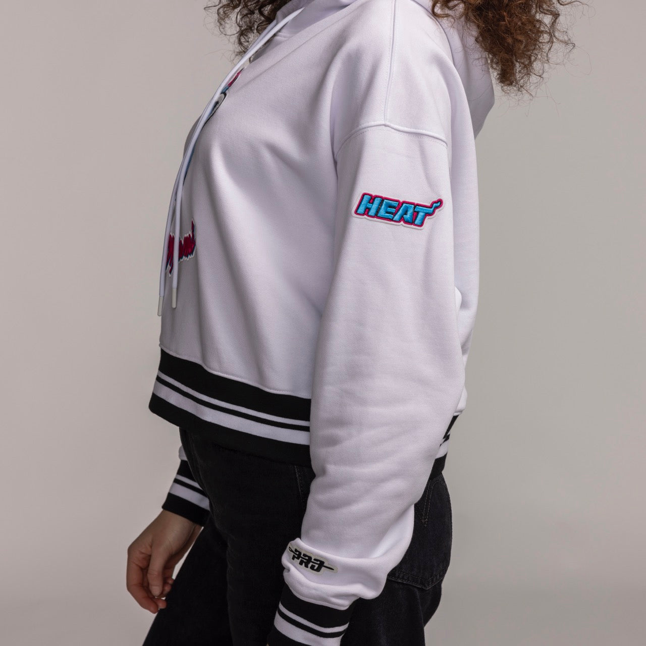 White cropped pullover hoodie with Miami HEAT logo and black striped cuffs and hem. - Pro Standard Miami HEAT Original Vice Women's Pullover Hoodie