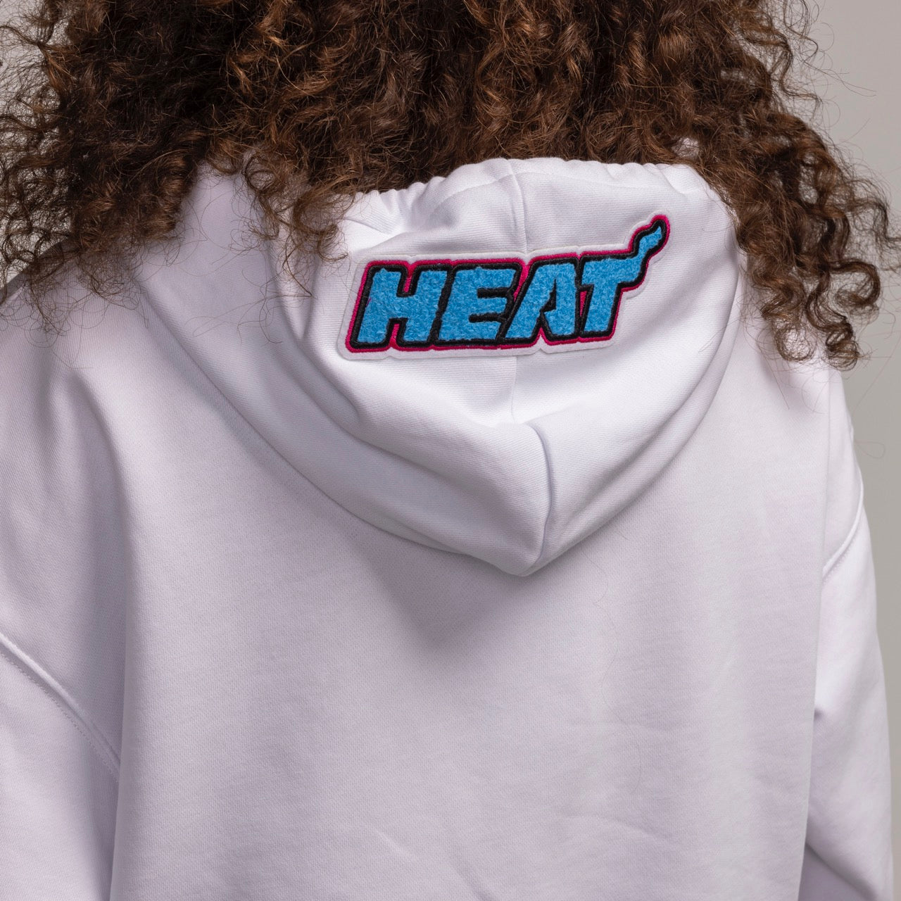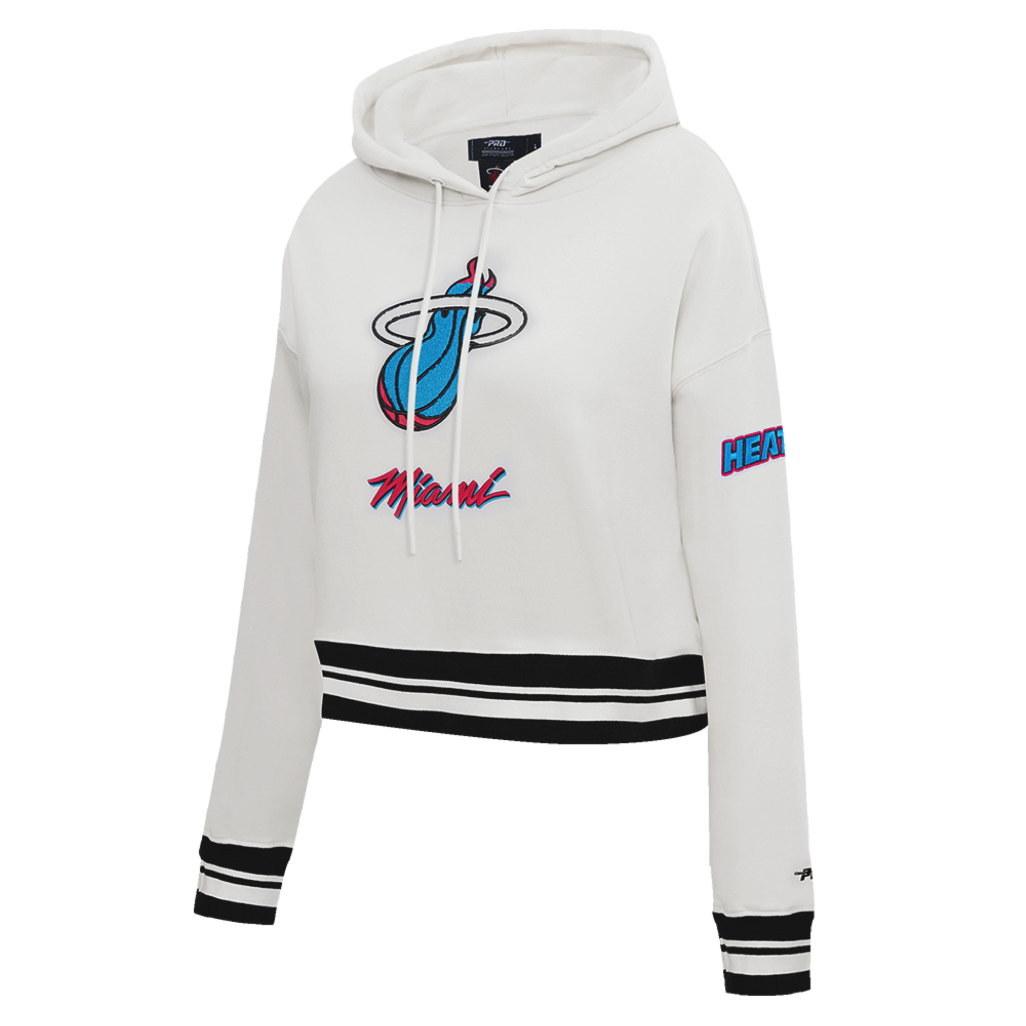 White cropped pullover hoodie with Miami HEAT logo and striped ribbed cuffs and hem. - Pro Standard Miami HEAT Original Vice Women's Pullover Hoodie