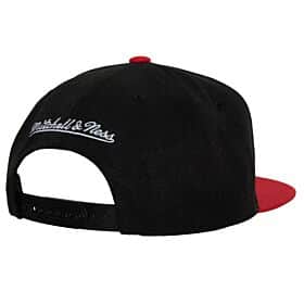 Black and red Miami HEAT snapback hat with embroidered Mitchel and Ness logo on back and adjustable strap.