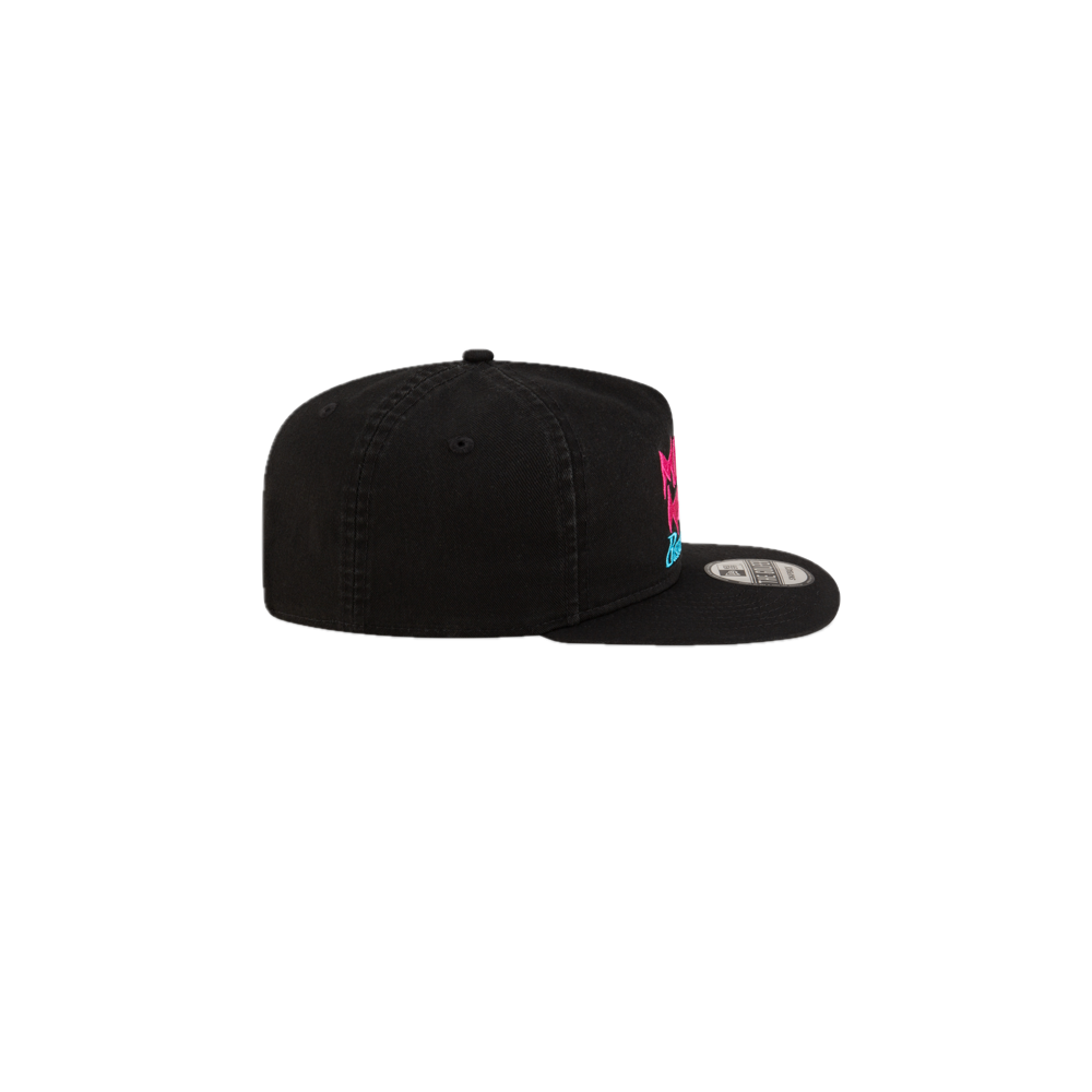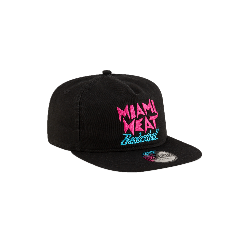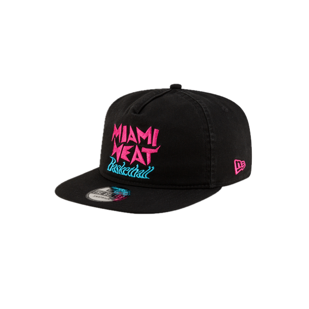 Black snapback cap with pink and blue Miami Heat basketball logo embroidery on front.