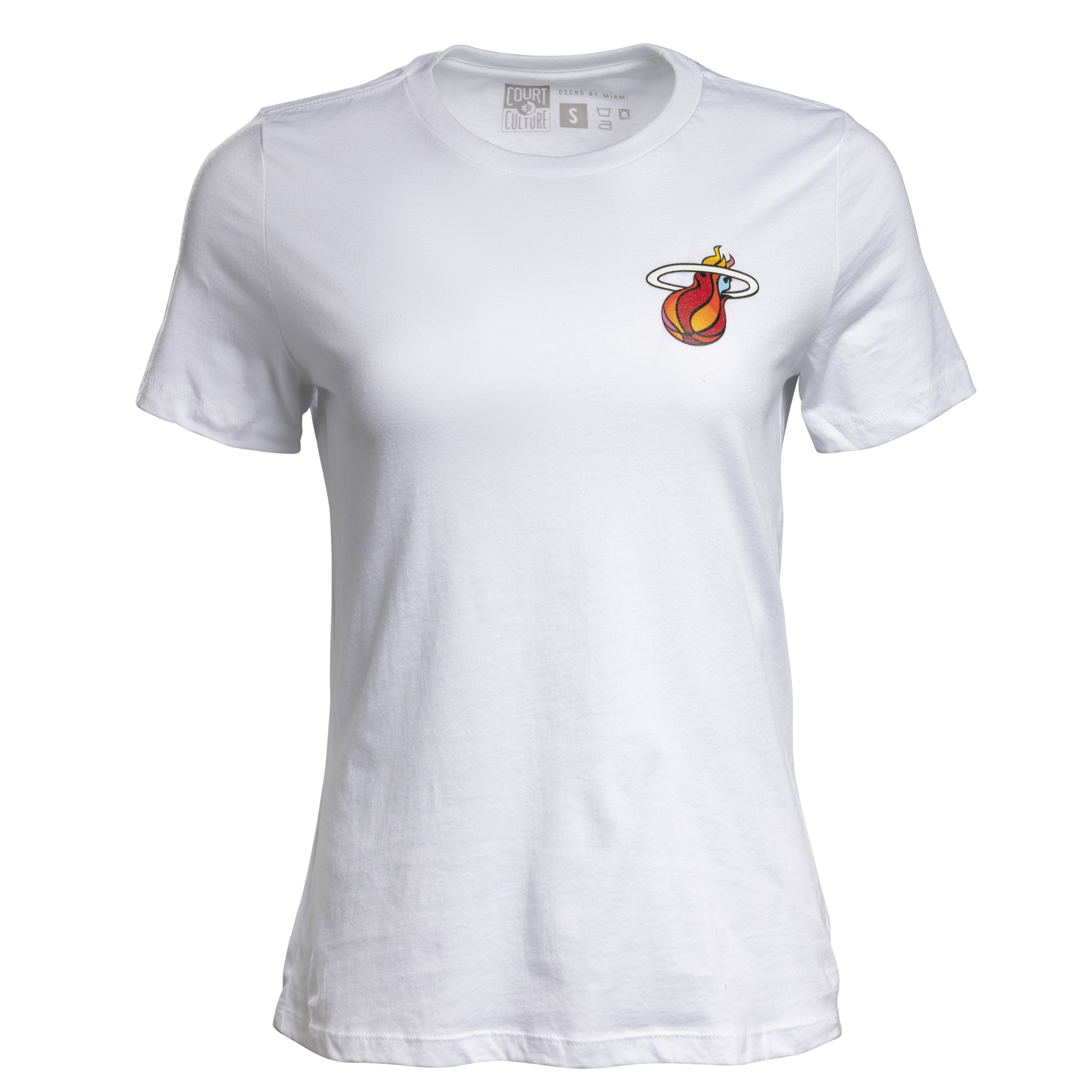 White women's tee with small Miami HEAT flaming basketball logo on chest. - Court Culture Miami Mashup Vol. 2 White Wordmark Women's Tee