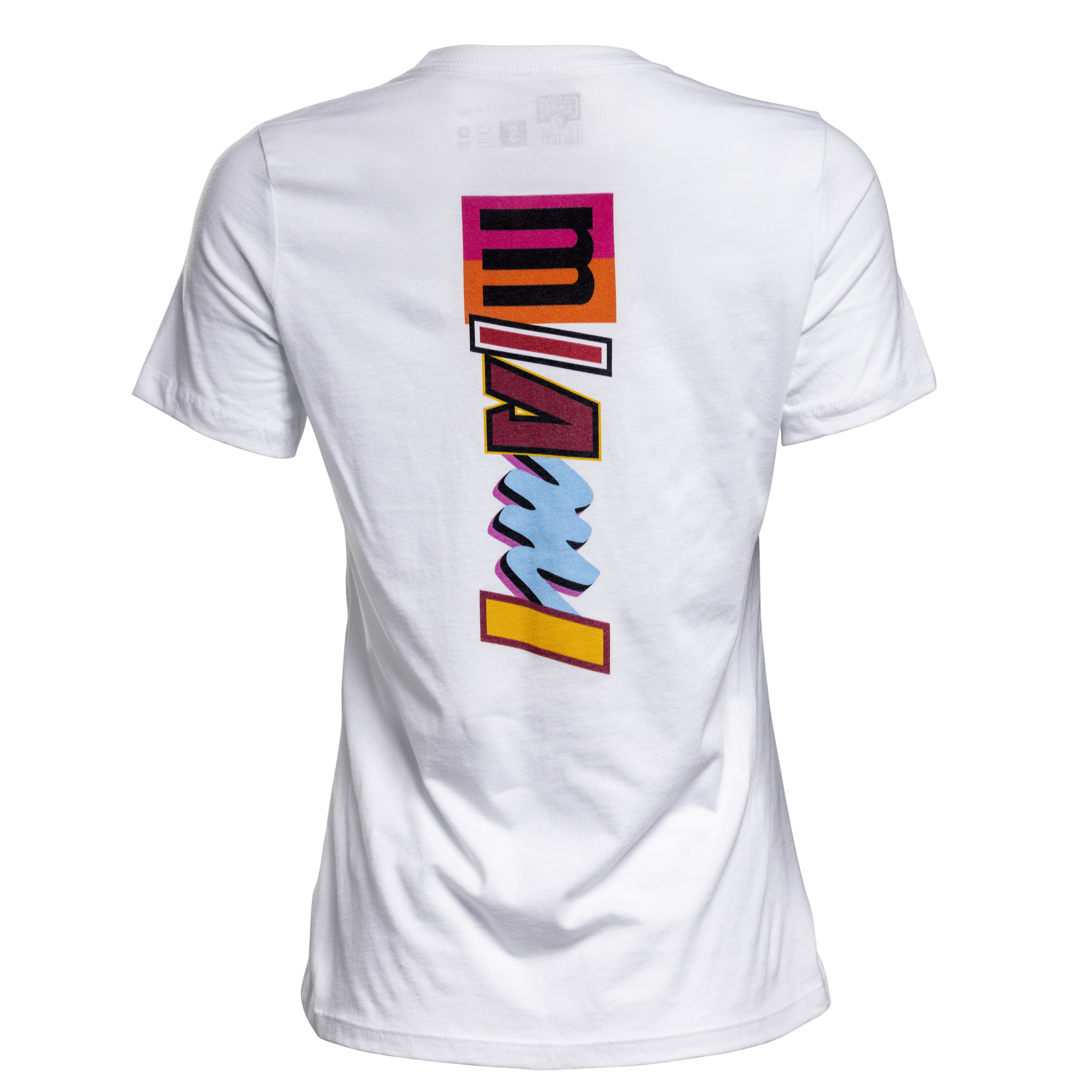 White women's tee with vertical colorful Miami HEAT mashup wordmark on back. - Court Culture Miami Mashup Vol. 2 White Wordmark Women's Tee