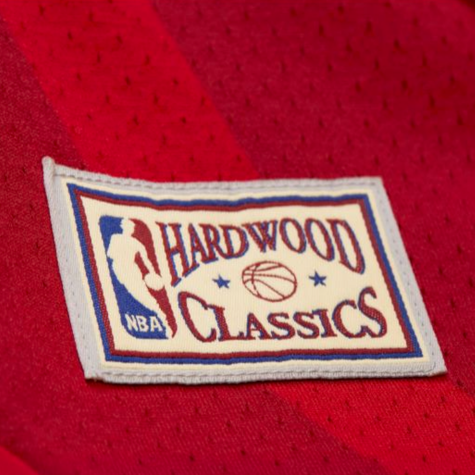 Someone wearing Mitchell & Ness x Purple Brand Miami HEAT Mesh Shorts, with team logos and a Hardwood Classics patch, stands facing away to highlight the back and side of these iconic red premium sport mesh shorts.