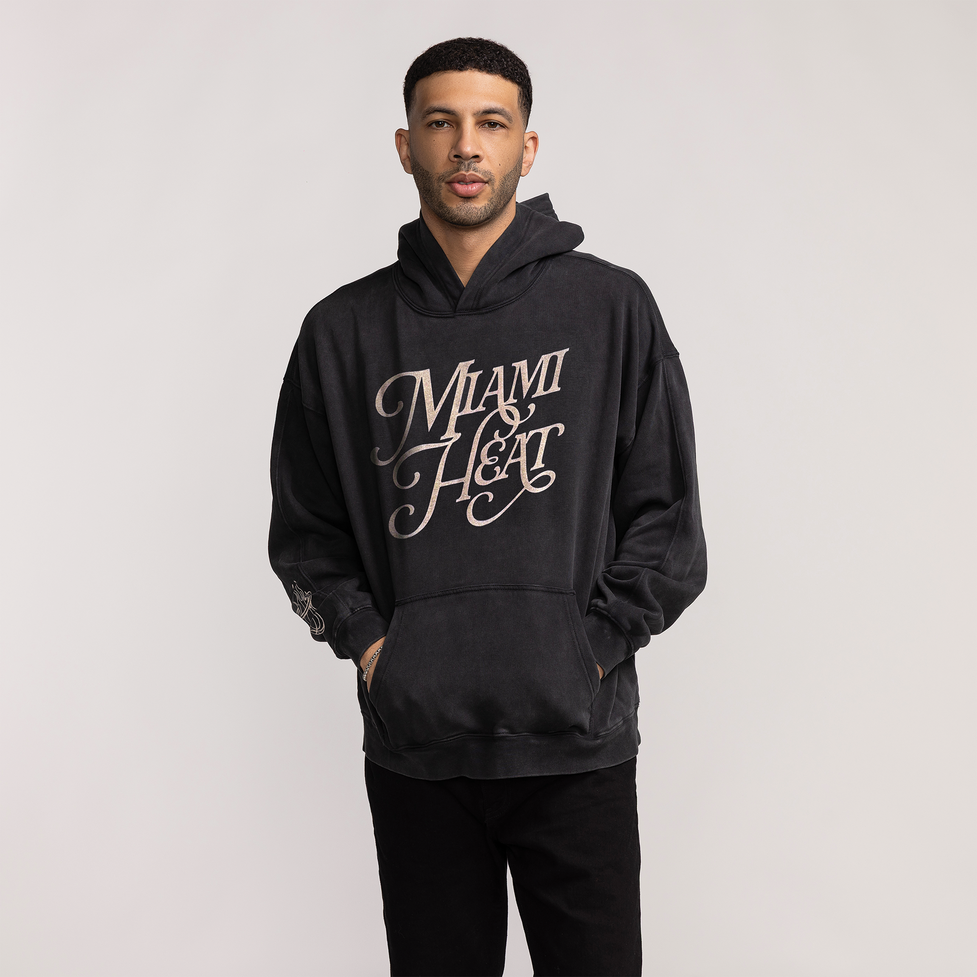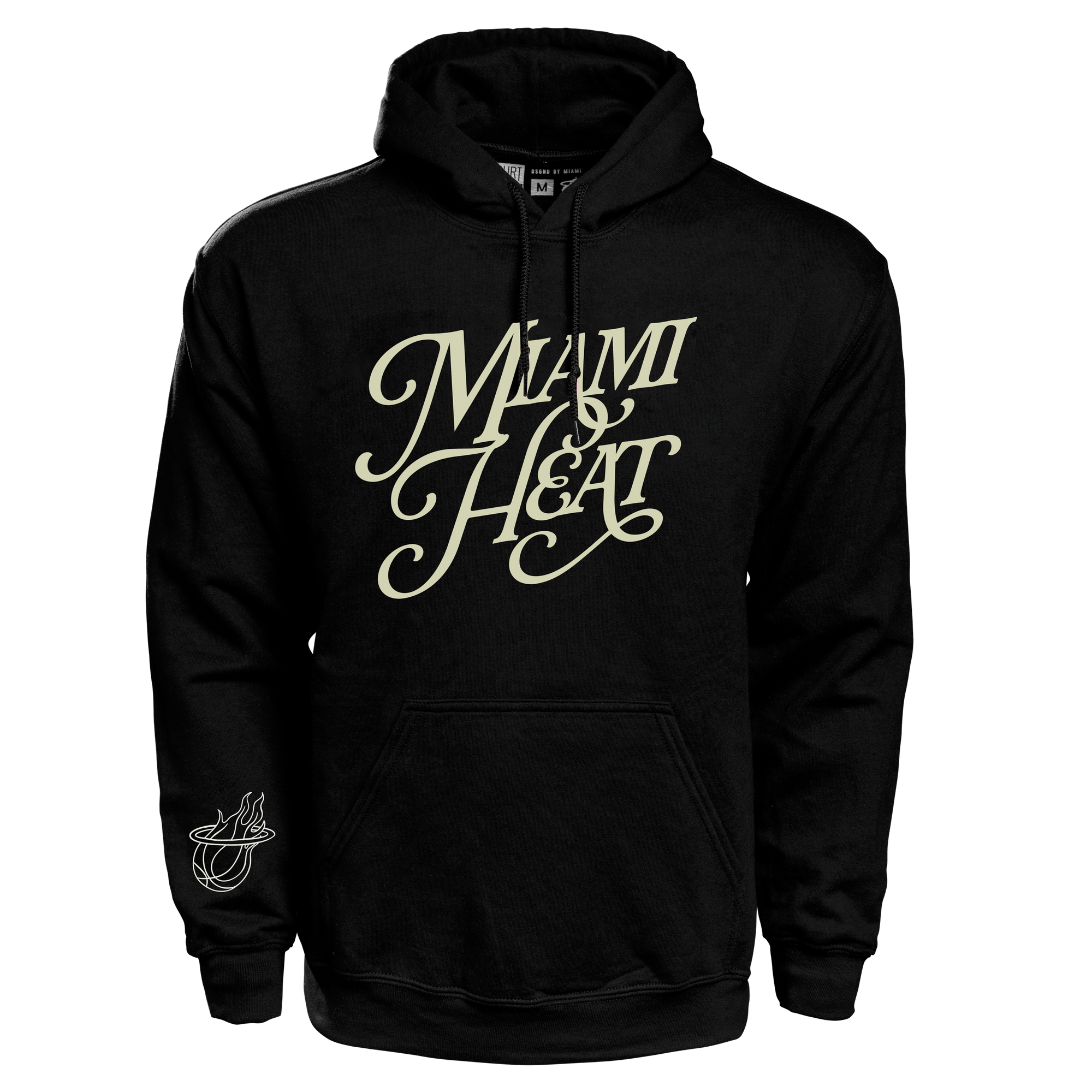 Black oversized hoodie with vintage cream Miami HEAT script logo and front kangaroo pocket. - Court Culture