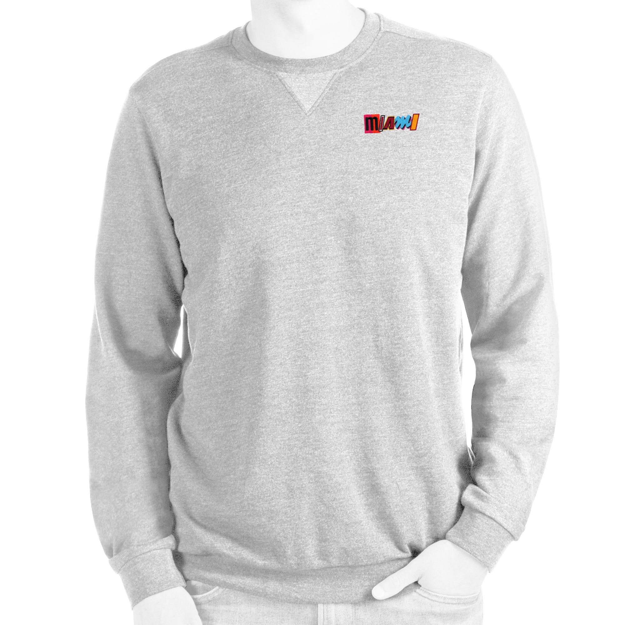 Light gray crewneck sweatshirt with colorful Miami HEAT mashup logo on left chest. - Antigua Miami Mashup Vol. 2 Crewneck