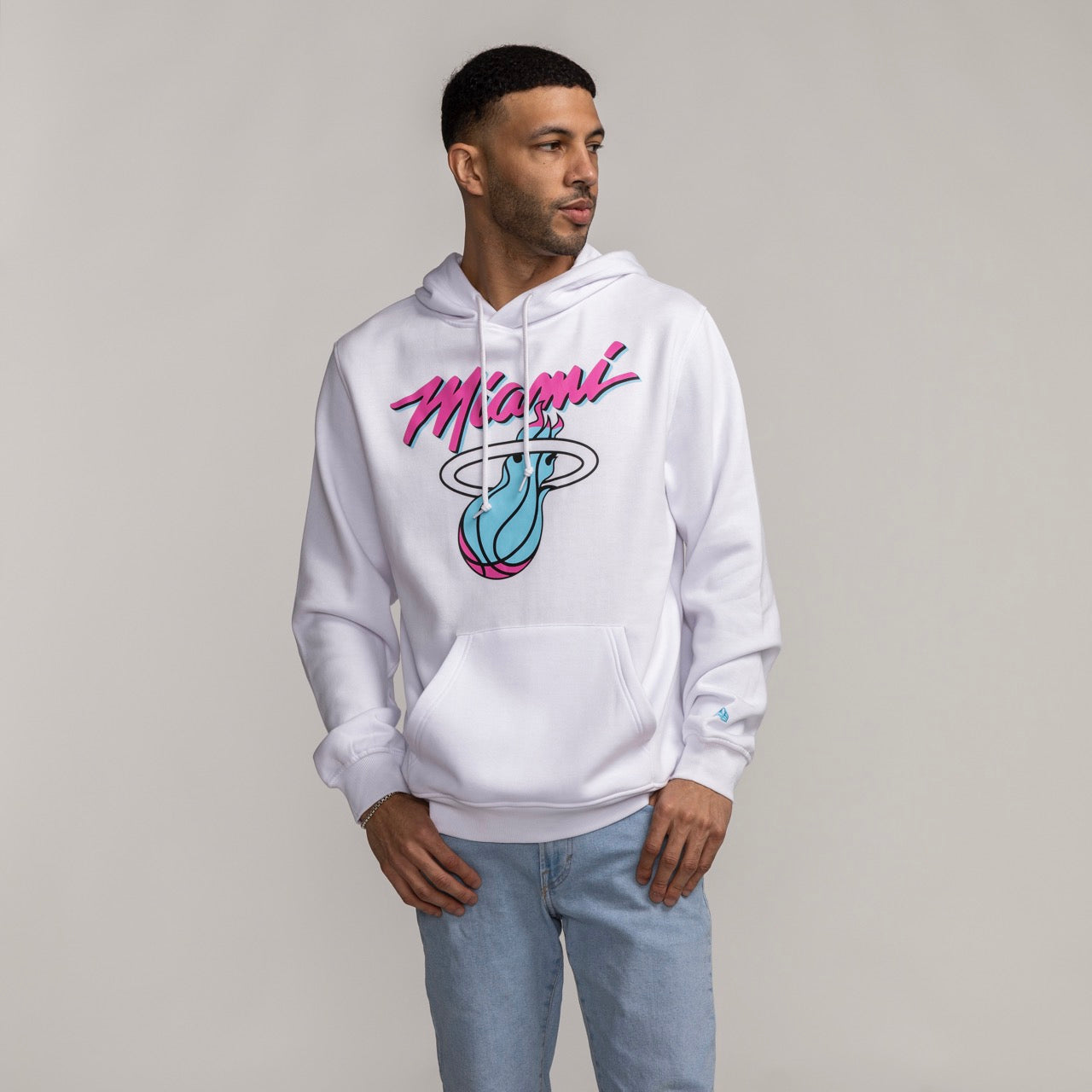 White New Era Miami HEAT pullover hoodie with pink and blue graphic logo, worn by male model. - New Era Miami HEAT Original Vice Pullover Hoodie