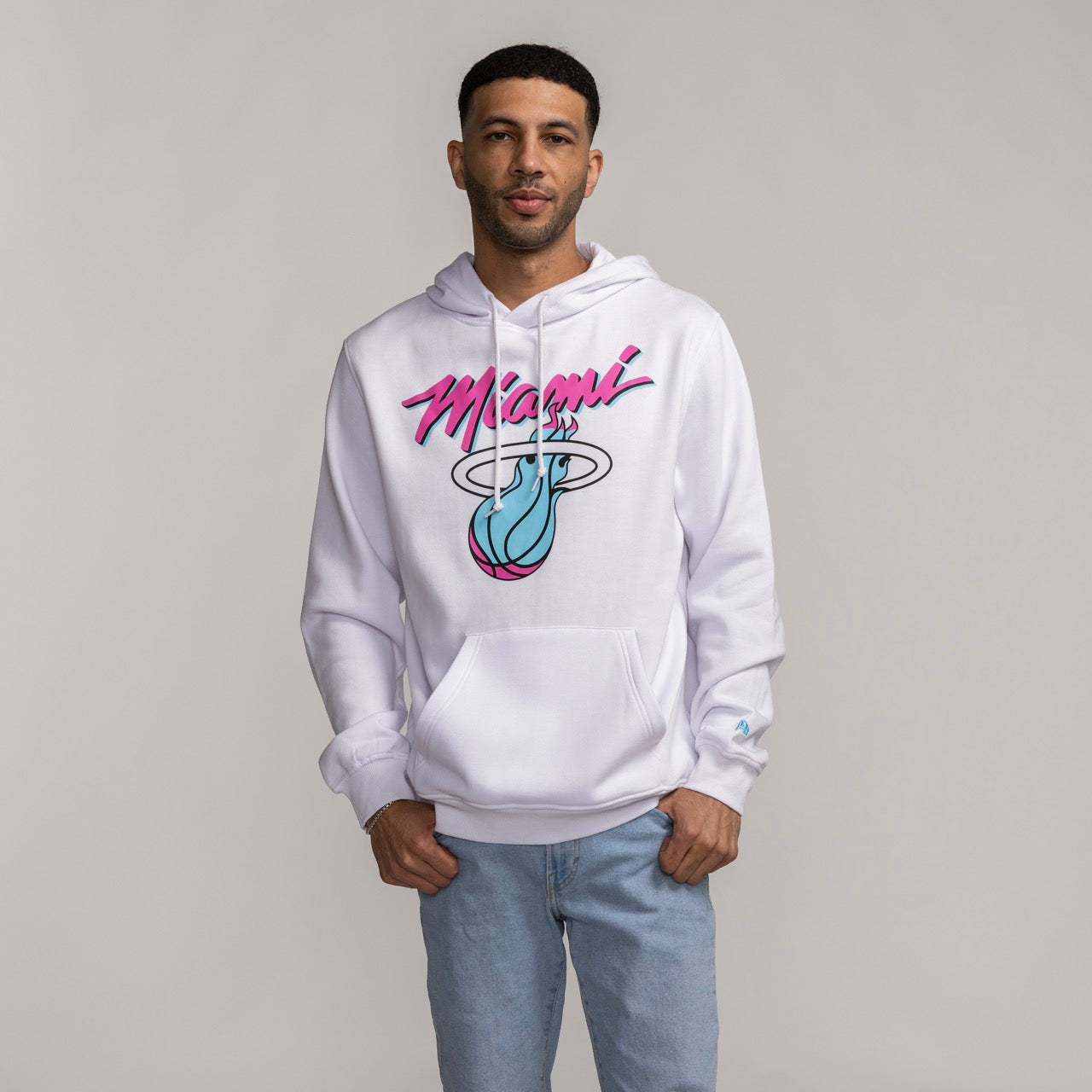 White New Era pullover hoodie with pink and blue Miami HEAT logo on front, worn by male model. - New Era Miami HEAT Original Vice Pullover Hoodie