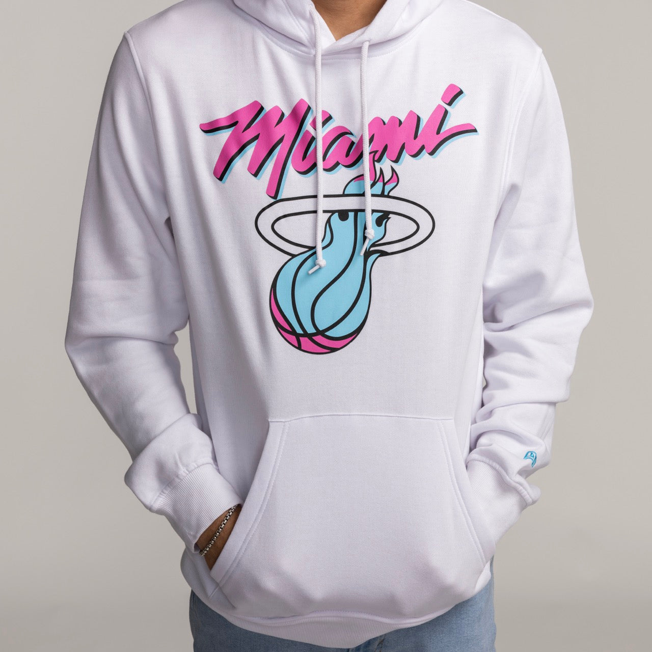 White New Era Miami HEAT hoodie with pink and blue Miami script and flaming basketball logo. - New Era Miami HEAT Original Vice Pullover Hoodie