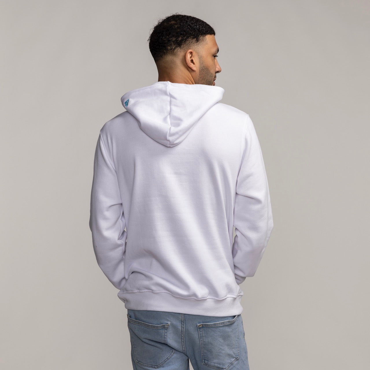 White New Era Miami HEAT Original Vice pullover hoodie with hood, worn with light-wash jeans, back view. - New Era Miami HEAT Original Vice Pullover Hoodie
