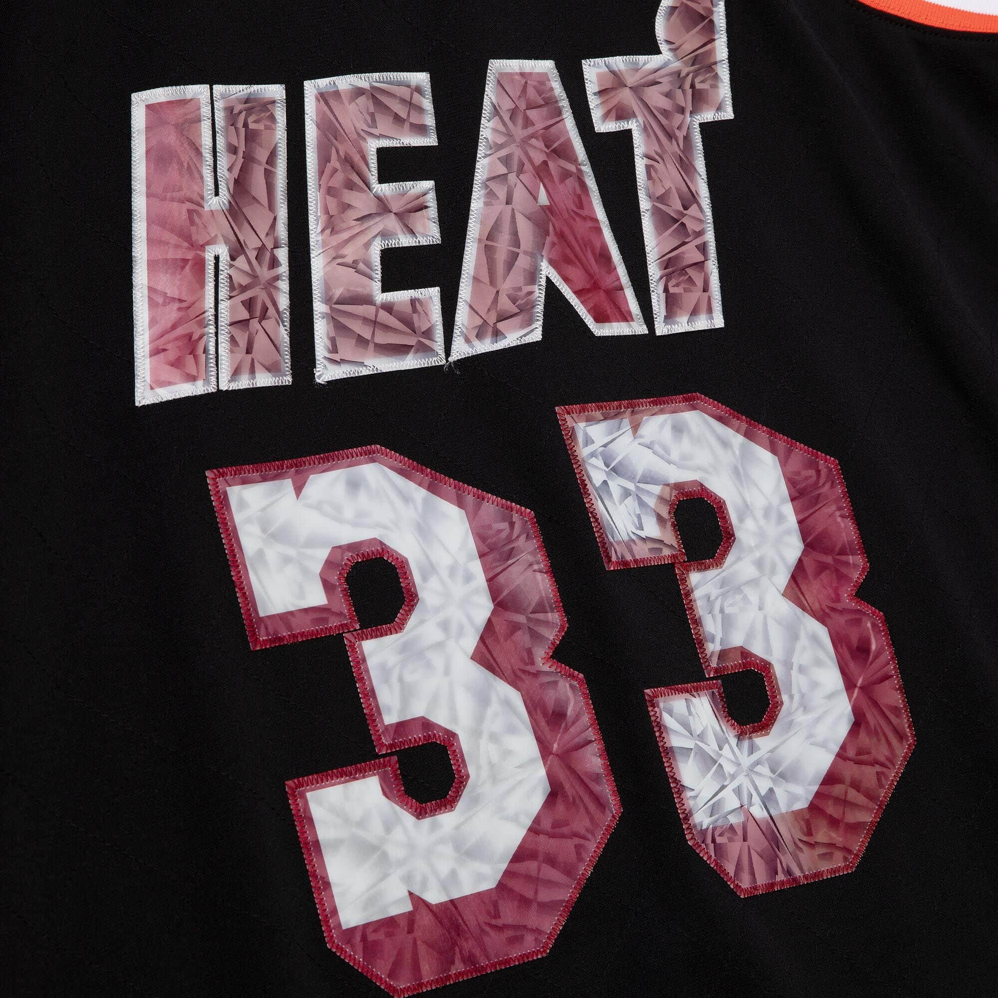 Black Miami HEAT jersey with red and white 33 and textured HEAT lettering on front. - Alonzo Mourning Mitchell and Ness Miami HEAT 75th Anniversary Lenticular Swingman Jersey
