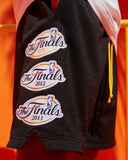 Black Miami HEAT basketball shorts with yellow drawstring, Finals logos on left leg, and team logo on right leg.