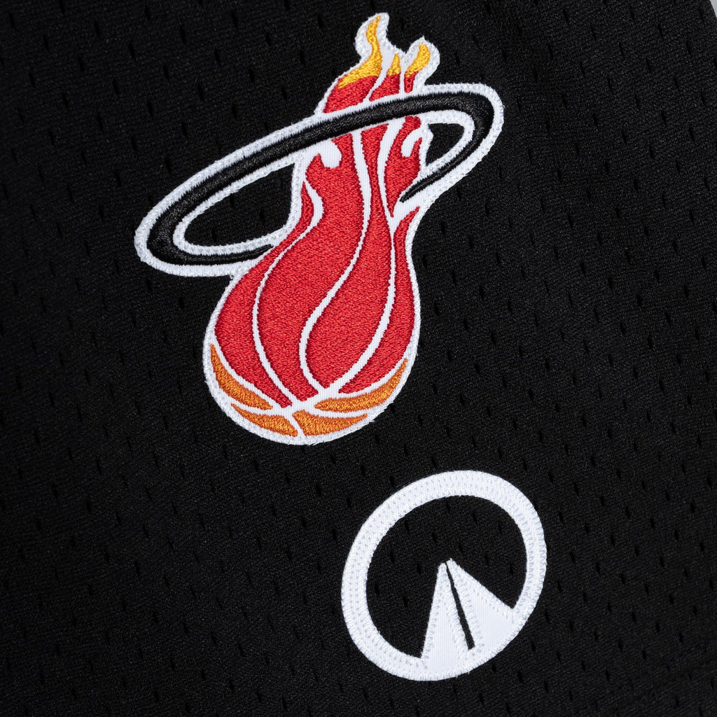 Black mesh Miami HEAT shorts with red and white team logo and white circular emblem on left leg.