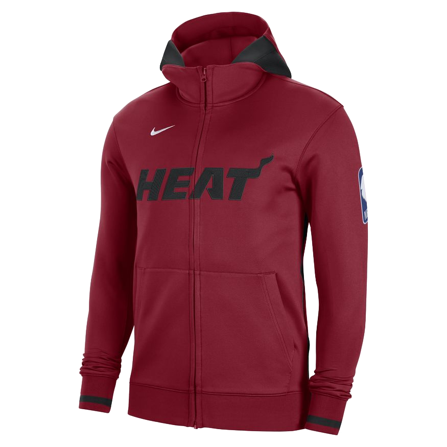 Maroon Nike Miami HEAT hoodie with full zip, black hood lining, and black HEAT logo on front. - Nike Miami HEAT On-Court Showtime Hoodie