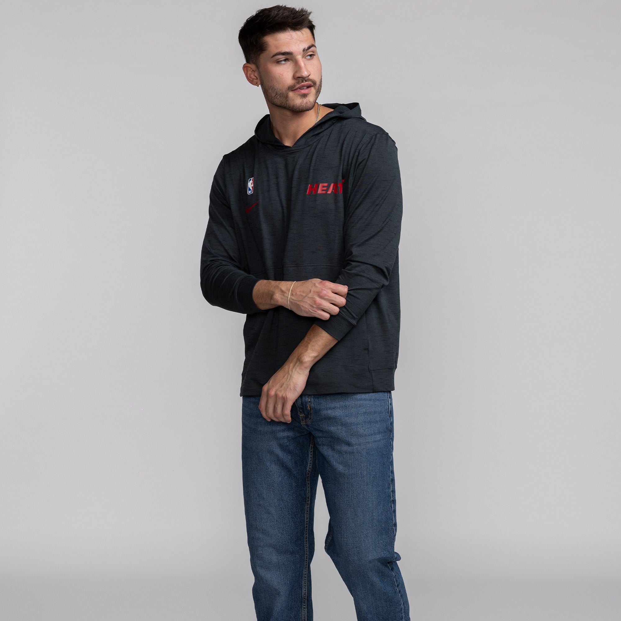 Black Nike Miami HEAT lightweight pullover hoodie with red logo and hood, worn with jeans. - Nike Miami HEAT Lightweight Pullover Hoodie