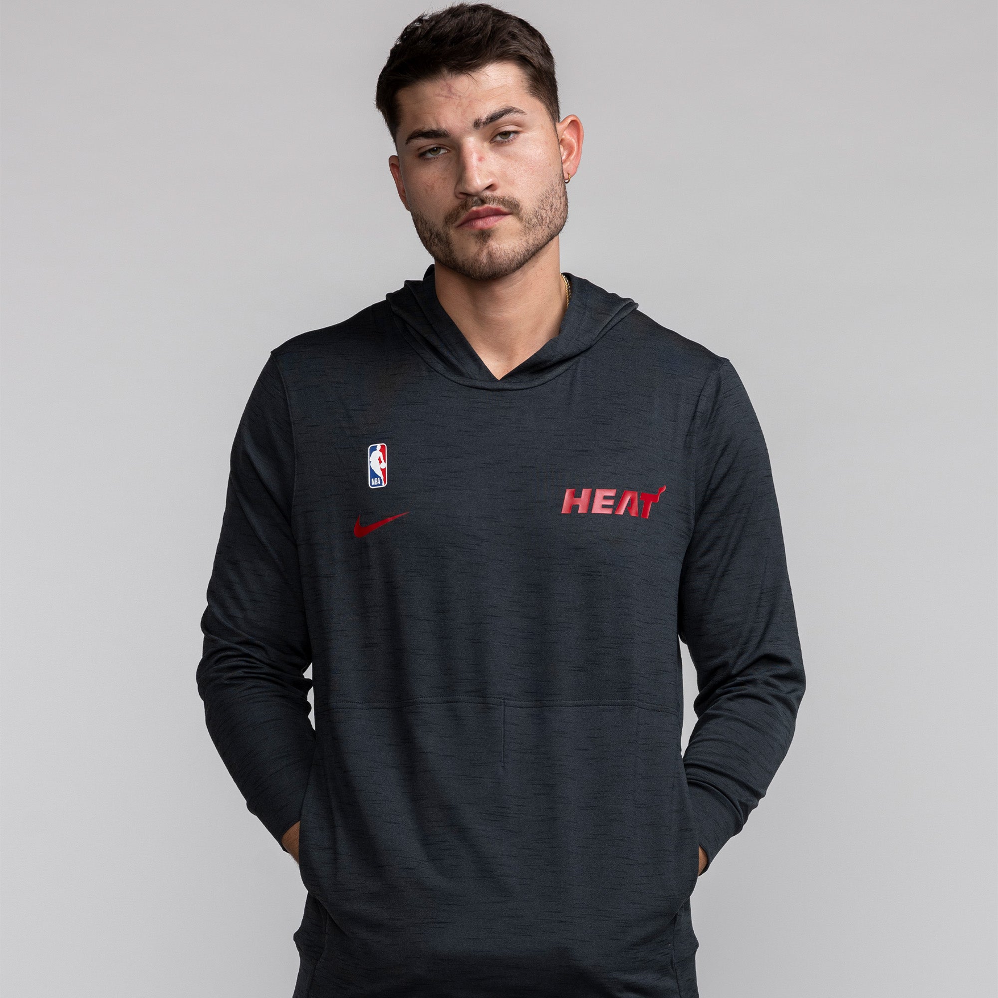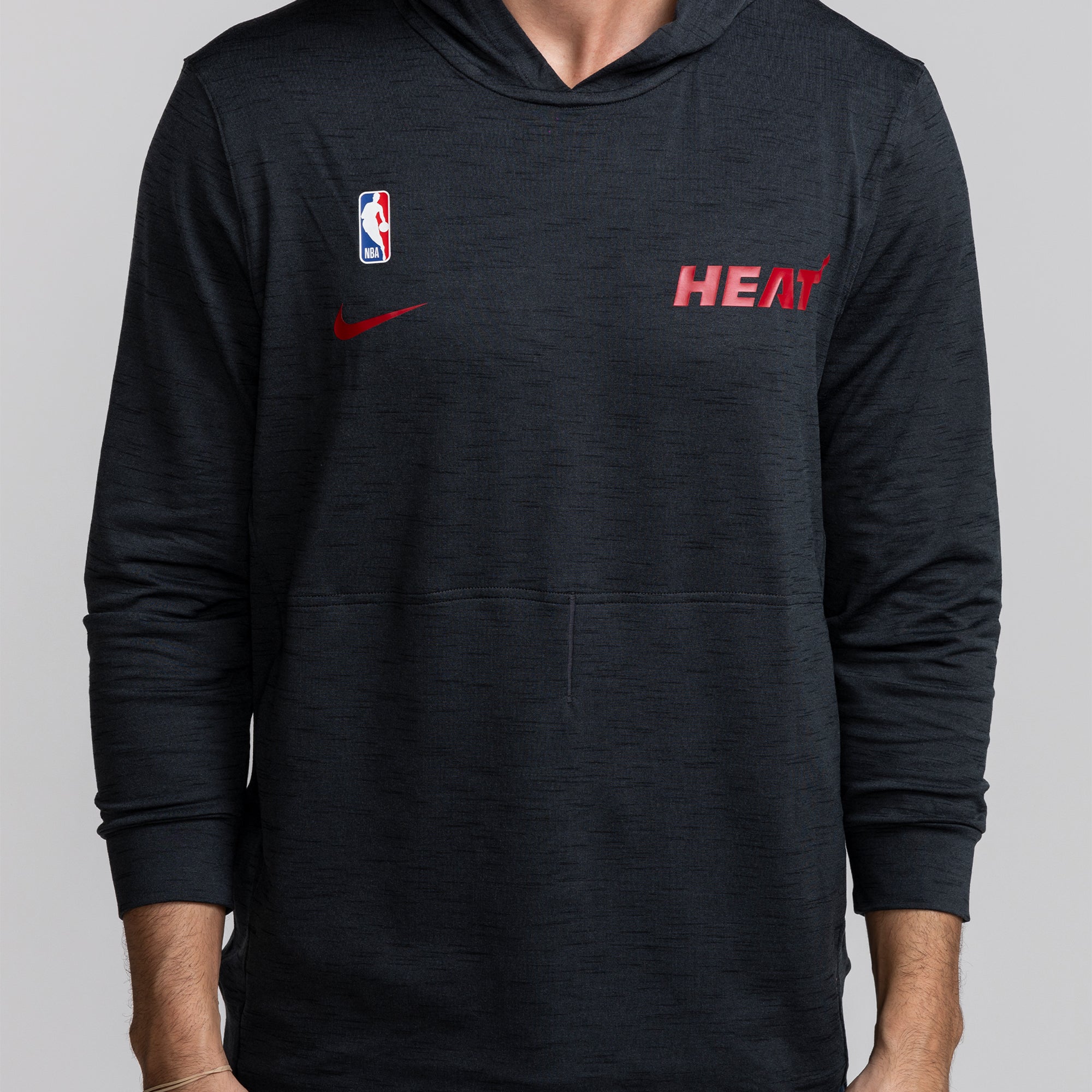 Black Nike Miami HEAT lightweight pullover hoodie with red logo and NBA patch, worn by male model. - Nike Miami HEAT Lightweight Pullover Hoodie