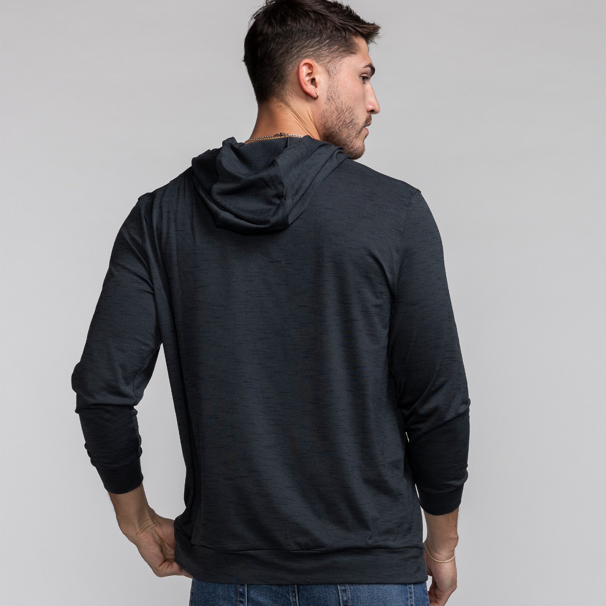 Black Nike Miami HEAT lightweight pullover hoodie with hood and long sleeves, worn from back. - Nike Miami HEAT Lightweight Pullover Hoodie
