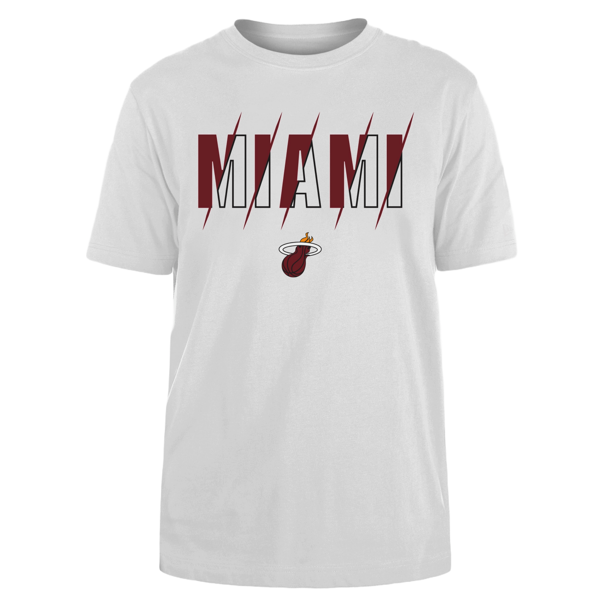 White New Era Miami HEAT t-shirt with slash design and team logo on front. - New Era Miami HEAT Slash Tee