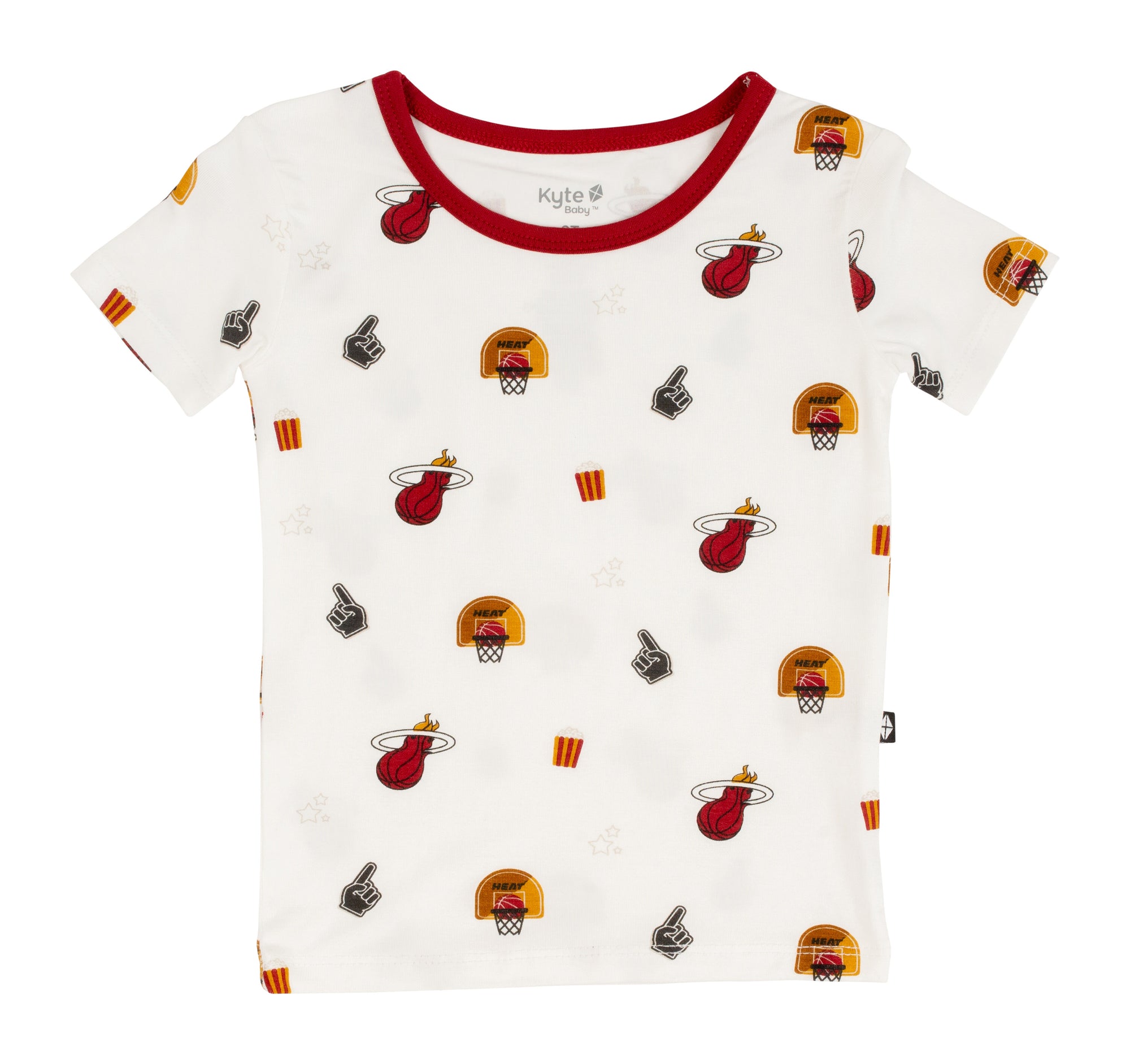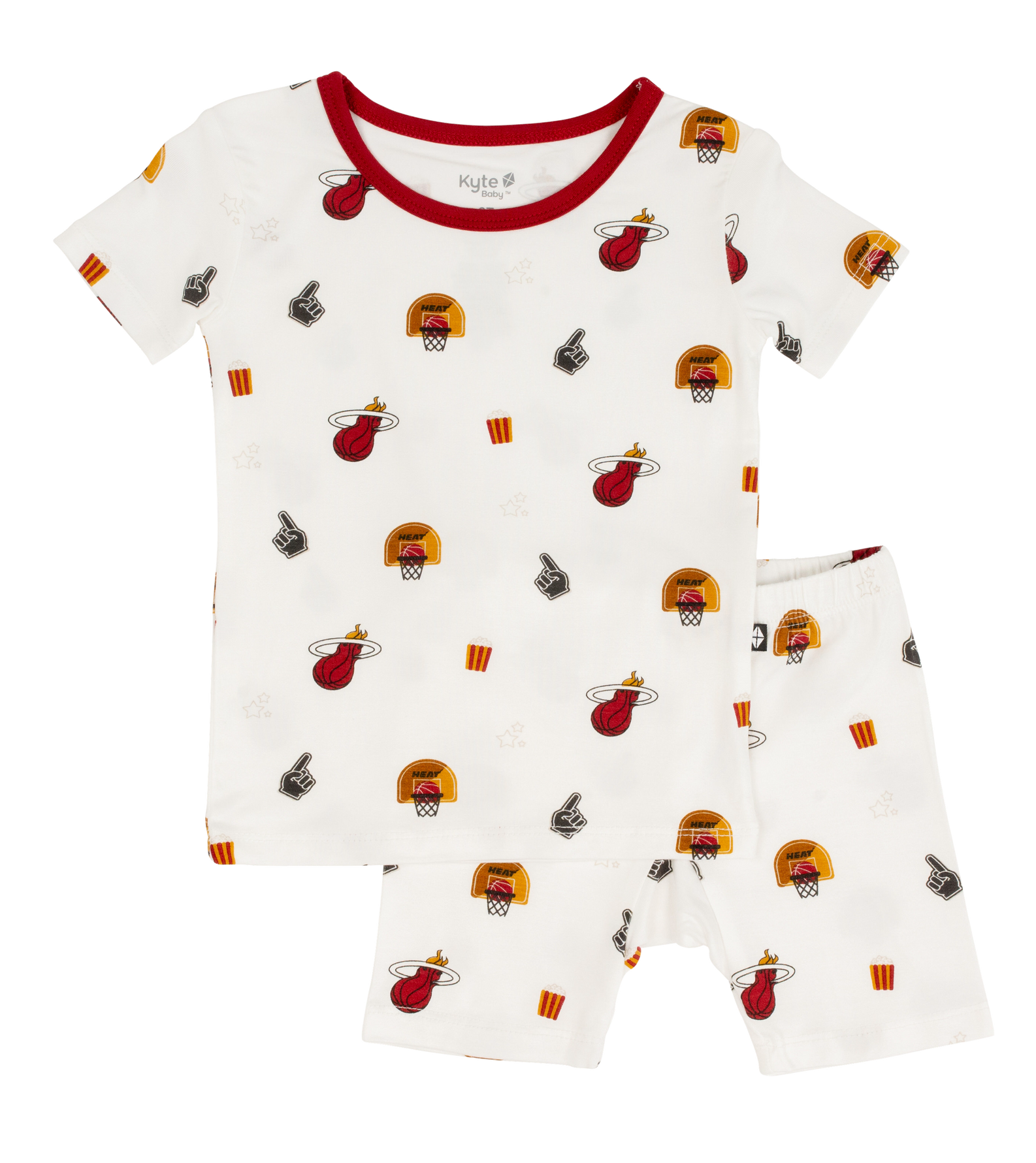 Toddler white short sleeve PJ set with red collar and Miami HEAT-themed basketball and hoop print. - Court Culture x Kyte Baby Game Day Cloud Toddler Short Sleeve PJ Set