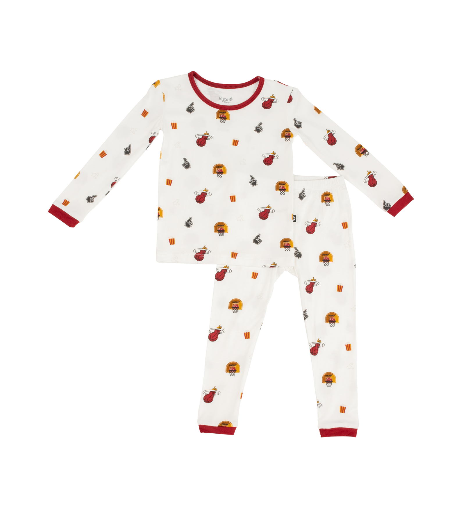 Toddler white pajamas with all-over Miami HEAT basketball and flamingo print, red trim collar and cuffs. - Court Culture x Kyte Baby Game Day Cloud Toddler PJ Set