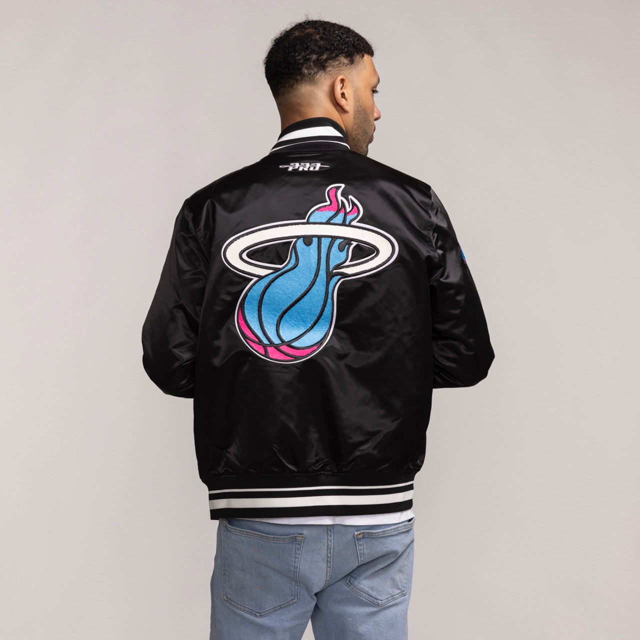 Men's black satin jacket with large blue and pink Miami HEAT logo on back and striped collar. - Pro Standard Miami HEAT Original Vice Satin Jacket